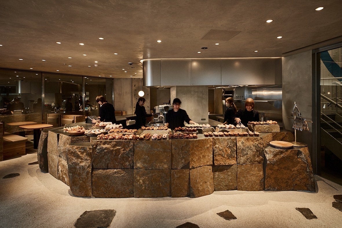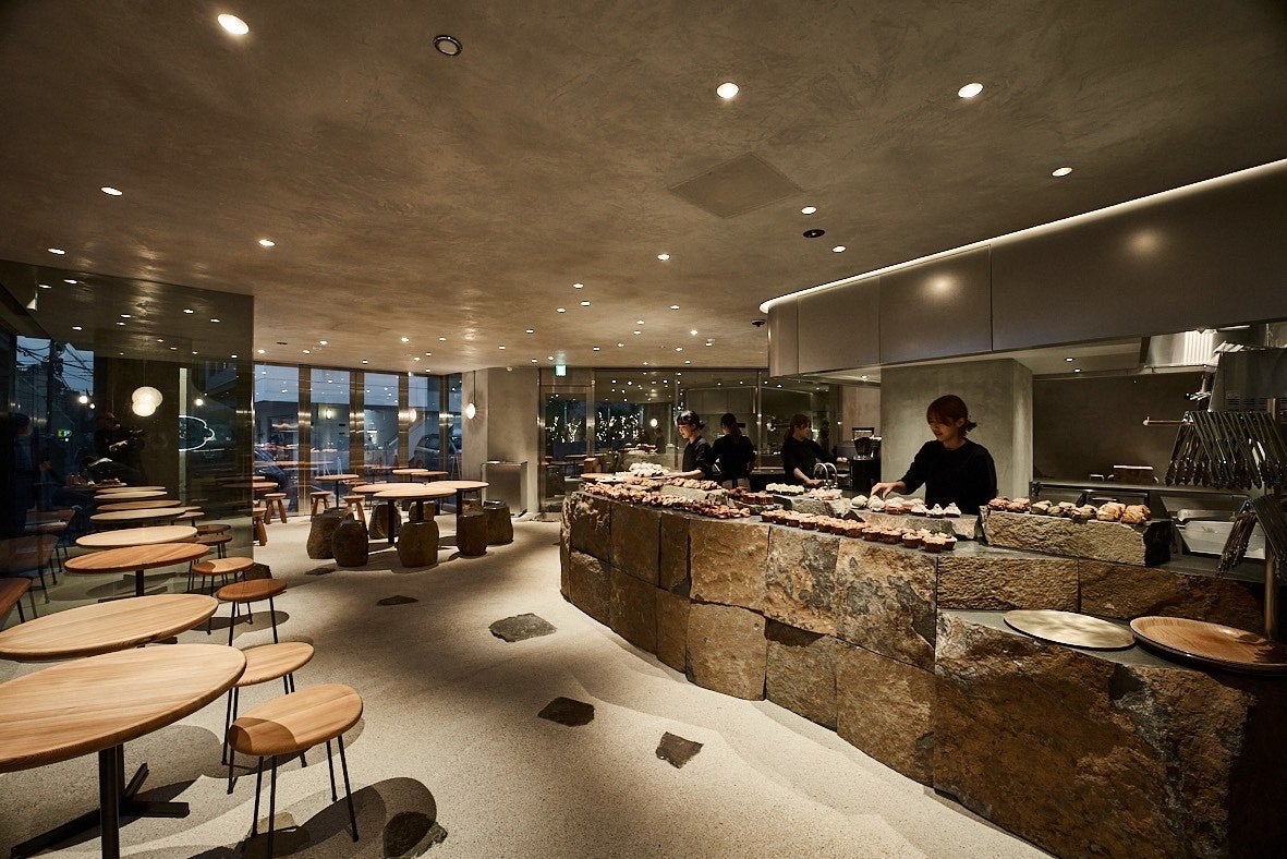 店内は、“石の町にある小さなパン屋さん”をコンセプトとするアマムダコタンの世界観を引き継ぎ、石と木を組み合わせた落ち着いた空間構成に仕上げています。ベンチやスツールの座面、テーブル天板には木工職人がひとつひとつ手作業で仕上げた杉材を採用。木の温もりと手仕事が息づく贅沢な空間で、焼き菓子やパンの香りをすぐそばに感じながら、丁寧で豊かな時間をお楽しみいただけます。