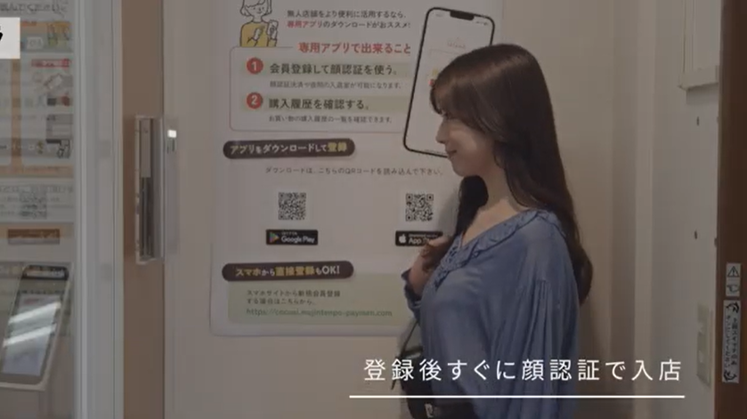 利用者はスマホアプリで顔写真を登録するだけで、会員登録 → 入店 → 決済までをワンストップで完了できます。顔認証が使えない場合は、二次元コードでも入店・決済が可能です。