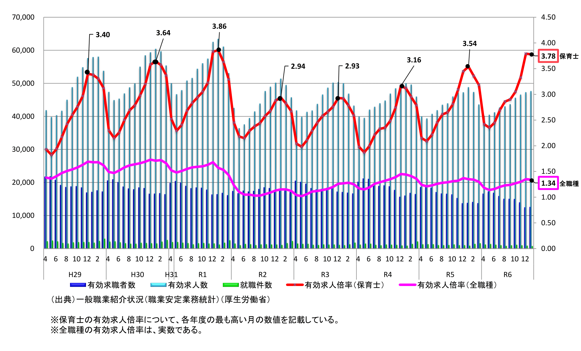 出典:こども家庭庁公表「保育士の有効求人倍率の推移(全国)」令和7年1月