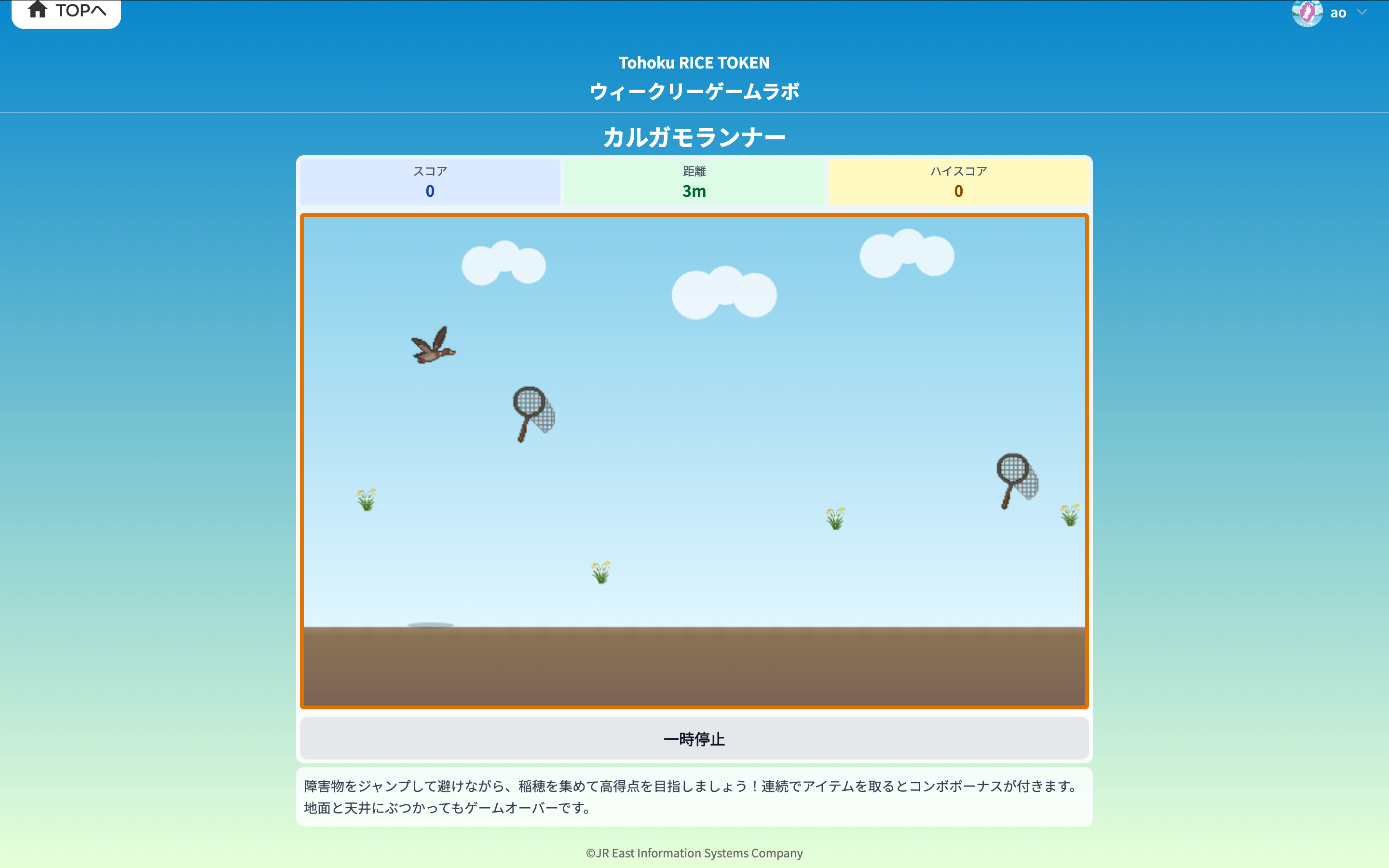 ミニゲーム「カルガモランナー」のプレイ画面