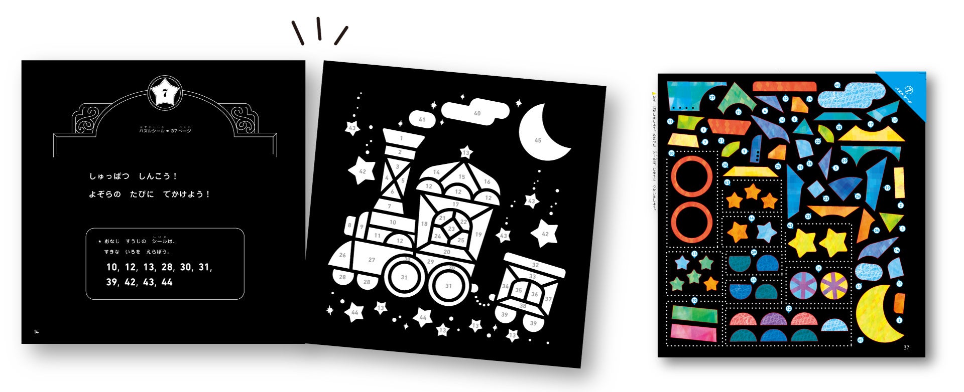 [画像2: https://prcdn.freetls.fastly.net/release_image/2535/8445/2535-8445-7130b6939903632a4d4e2d7688fe6e63-1920x1188.jpg?width=536&quality=85%2C75&format=jpeg&auto=webp&fit=bounds&bg-color=fff ]本書は、真っ黒な背景に色鮮やかなシールを貼って、ステンドグラス風のイラストを完成させるシールパズル。色とりどりのシールから自由に色を選んだり、シールの形を感じたりすることで、色彩感覚や形の感覚が育まれます。