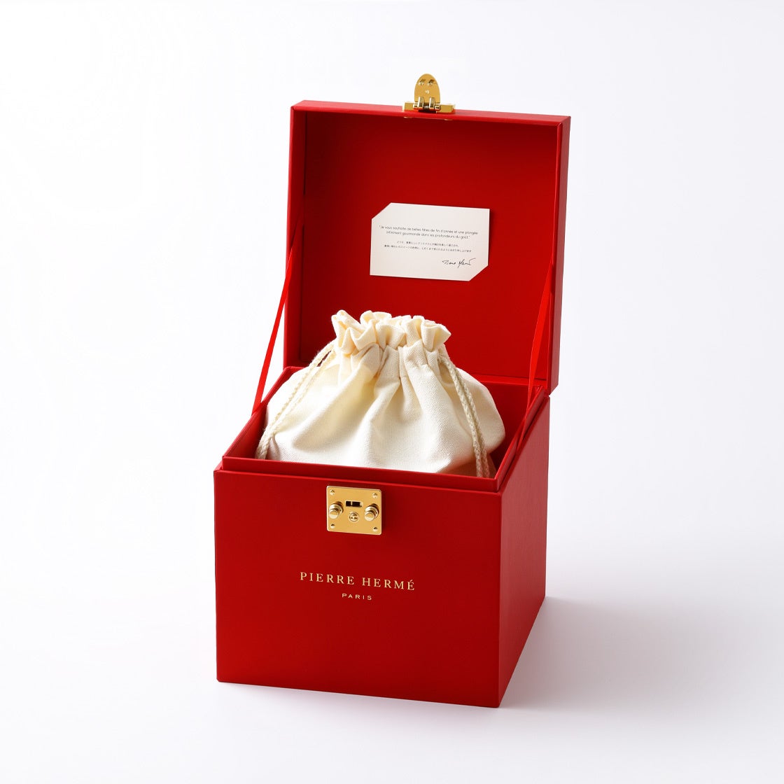 新作「パネットーネ オ レザン エ ア ロランジュ」には、ピエール・エルメならではの技術と素材へのこだわりが発揮されています。ホリデーシーズンにふさわしい鮮やかなレッドが印象的な特製ボックスには、ピエール・エルメからのメッセージカードが付属しています。