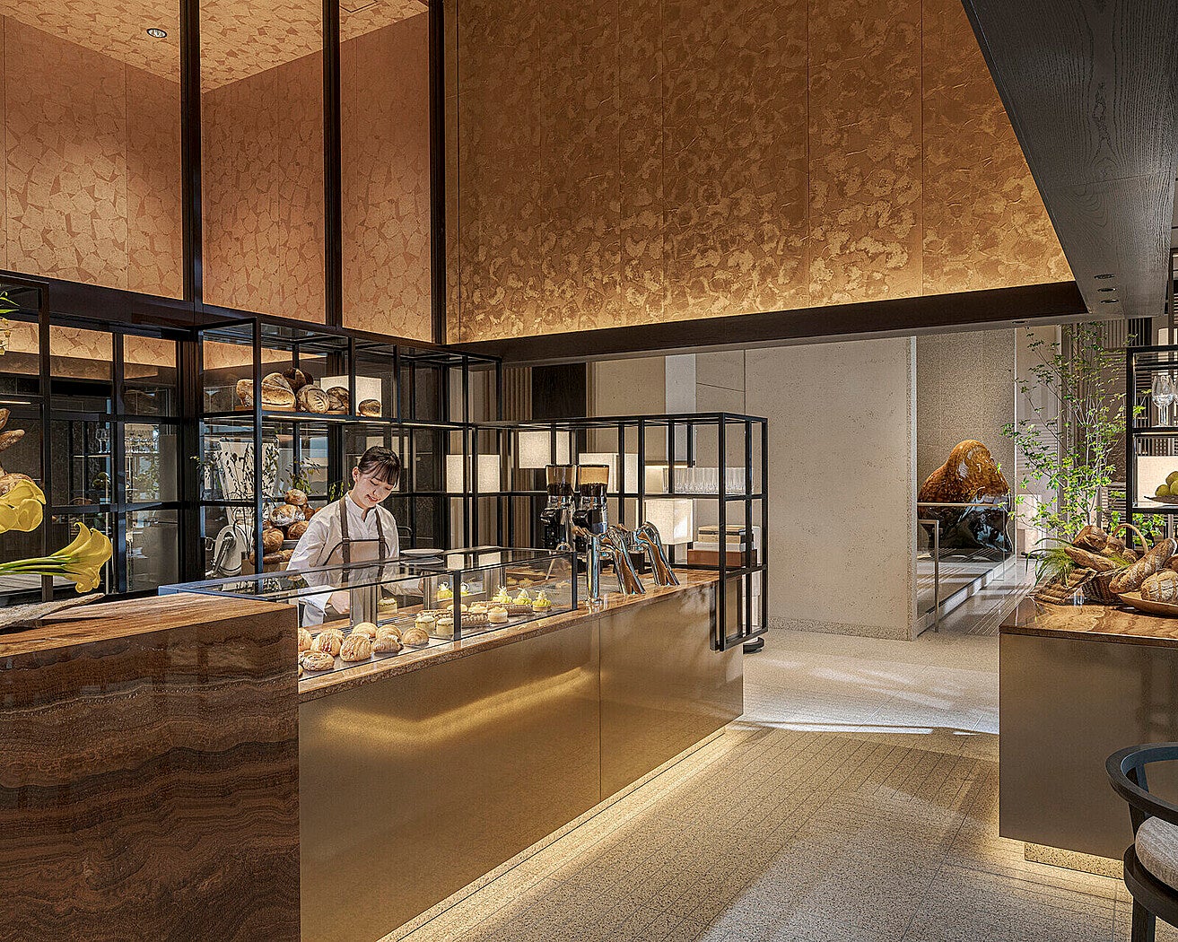 1階ロビーに隣接するベーカリーショップ「ファリーヌ」では、ショーキッチンから次々と生み出される、まるで魔法のように芸術的なパンやペストリーの焼き上がりの香りが広がります。通りに面したエントランスから気軽に立ち寄れ、季節のペストリーや焼きたてパン、ケーキに加えてテイクアウトのコーヒーもお楽しみいただけます。