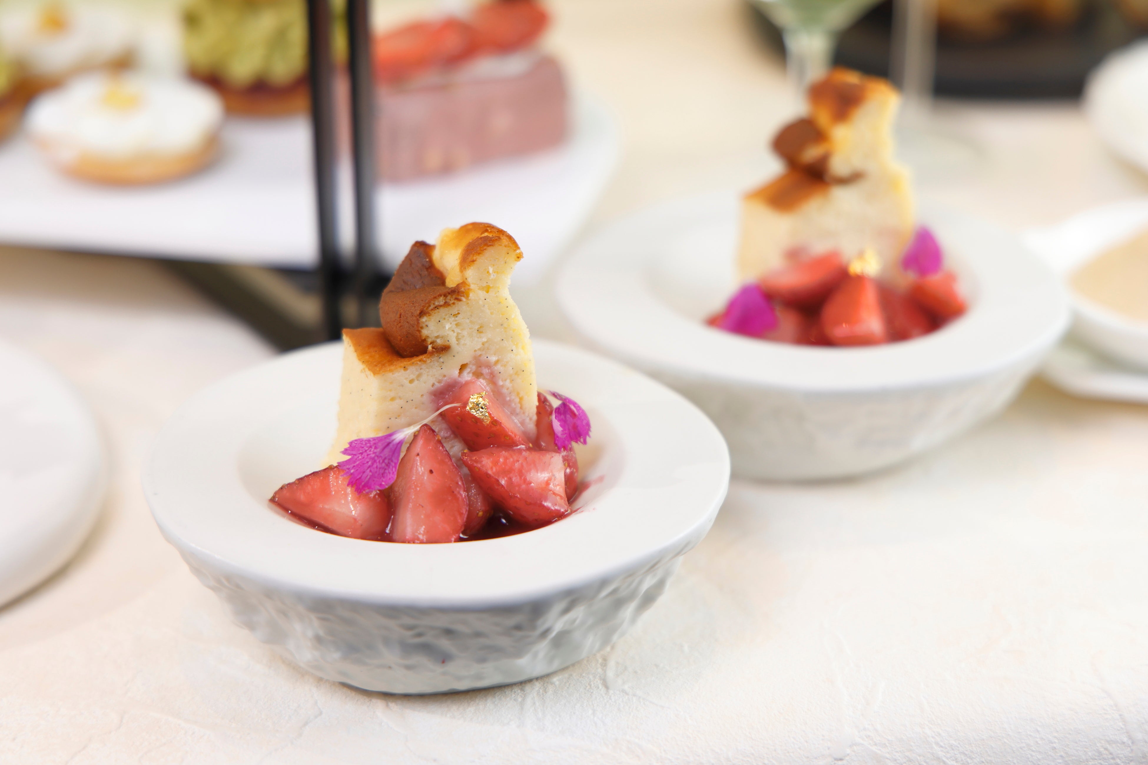 セイボリーには、苺と相性の良い食材を組み合わせ、新春から春へと移ろう季節の味覚を軽やかに表現しました。スモークダックとストロベリーを合わせた赤ワインフランのタルトをはじめ、オシェトラキャビアに桜の香りを纏わせたコンソメジュレと春菊のムースが織り成す華やかな一品、さらに菜の花と黒トリュフ、奥丹波鶏を重ねたサンドイッチなど、シェフの手による繊細な季節の恵みが並びます。