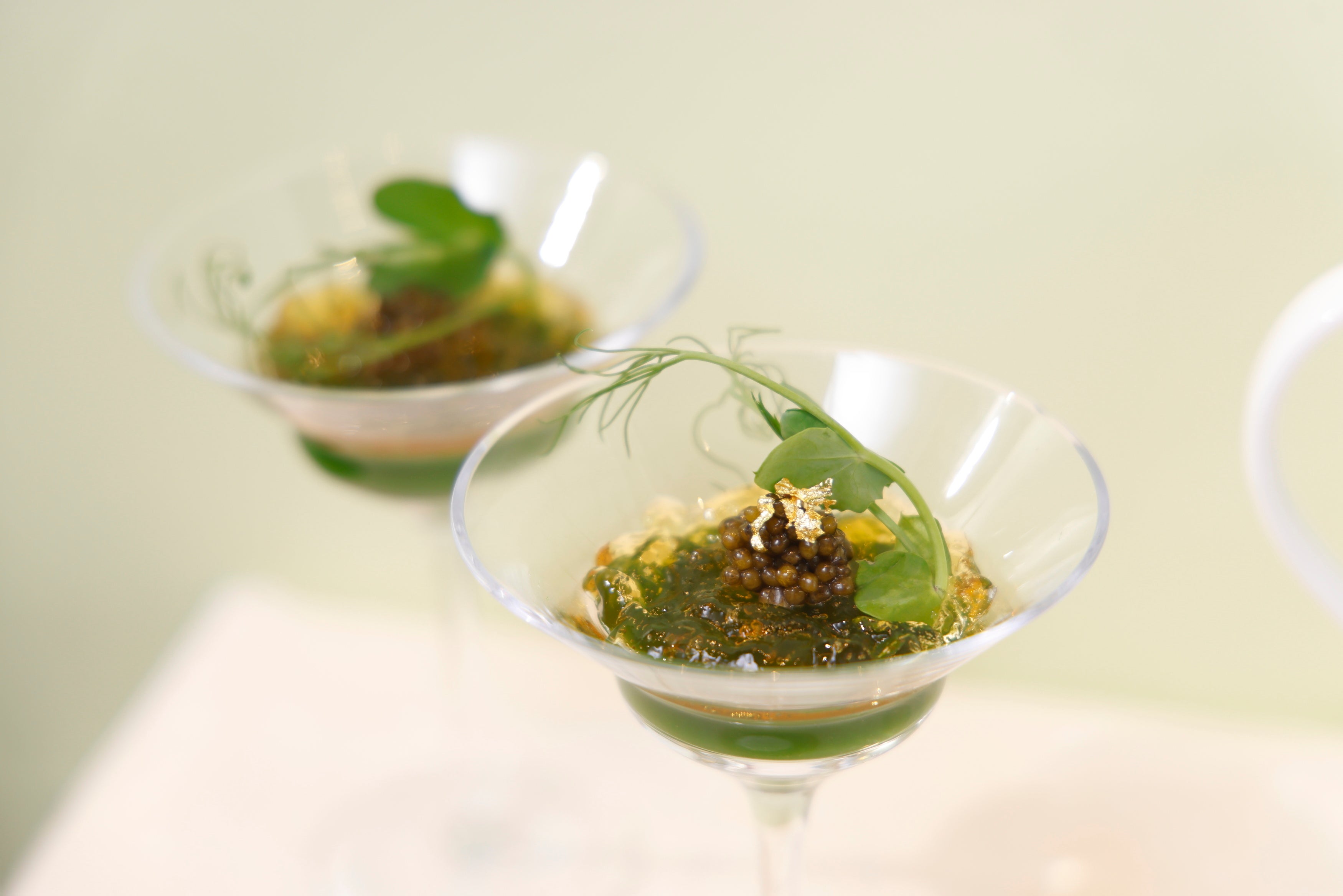 春菊のムースとオセトラキャビア、桜風味のコンソメゼリー