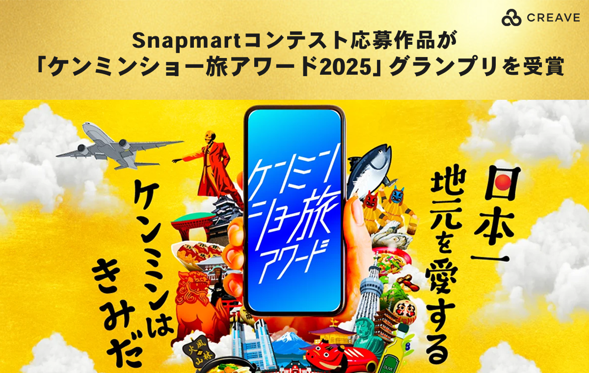 クリエイターとの共創を通じて企業のマーケティング課題を解決する、株式会社CREAVE(本社:東京都千代田区、代表取締役社長:中村真奈、以下 CREAVE)は、ケンミンショー旅アワード実行委員会(読売テレビ放送株式会社、株式会社プログレス)が実施する“ケンミン愛”あふれる動画の投稿を募るコンテスト「ケンミンショー旅アワード2025」において、CREAVEが運営する「Snapmart」で開催したコンテスト応募作品がグランプリを受賞しました。
