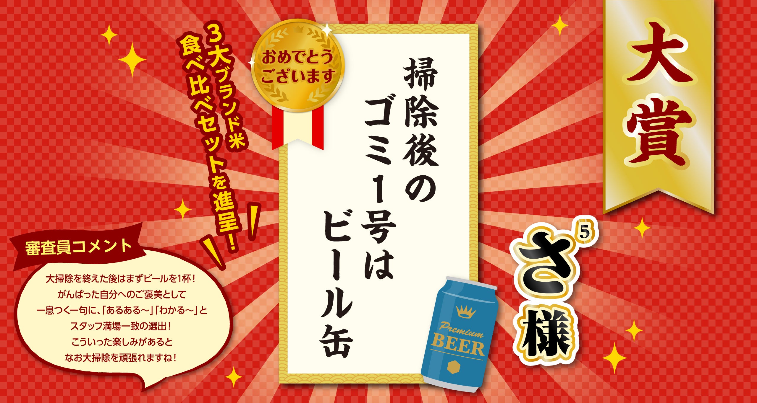 大賞には大掃除の後の一息をテーマにした一句が選ばれました。年末の大掃除をやり切った後、まず最初の一息でビールを一杯!掃除を頑張った自分へのご褒美としてのどを鳴らしながらビールを飲む光景が目に浮かび、さ⁵さんの一句を大賞に選出しました。1年の終わりに家中片付けけてスッキリした気持ちで飲むビールは格別に感じられそうですね。