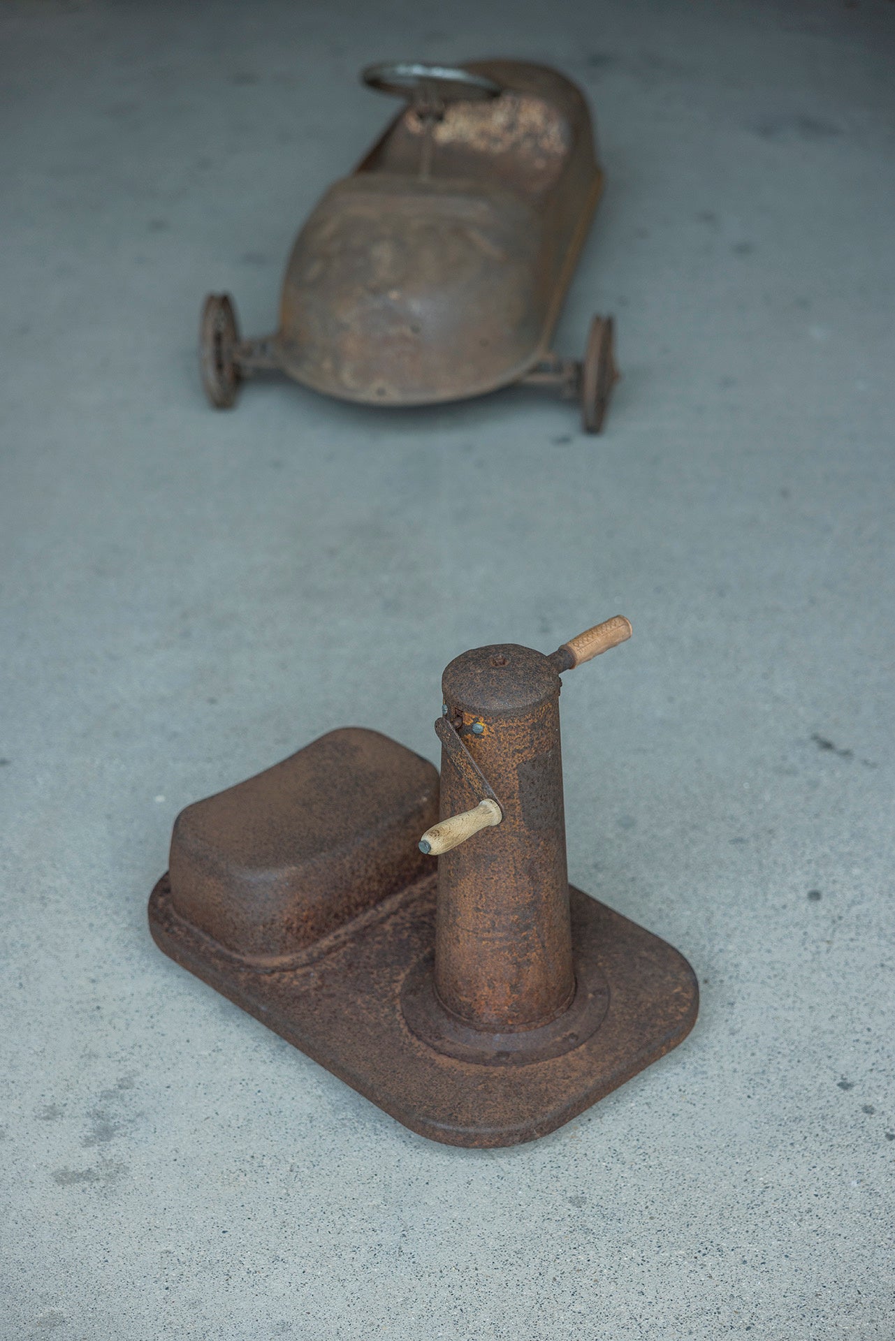 また、古物のキュレーション展示では、内田が30年にわたって蒐集してきた、ブランコ、滑り台、ペダルカー、ブリキの玩具、グローブなどの遊具が一堂に並びます。これらのコレクションは、国内外の蚤の市や骨董市から、さらには古い家の解体現場などから集められ、かつて誰かの成長を共にした背景をもちながらも、内田の目を通して再び意味を帯びたものたちです。作家の創作の糧にもなったこれらのオブジェは、時の経過によって醸し出されたノスタルジックな艶と味わいを宿しています。