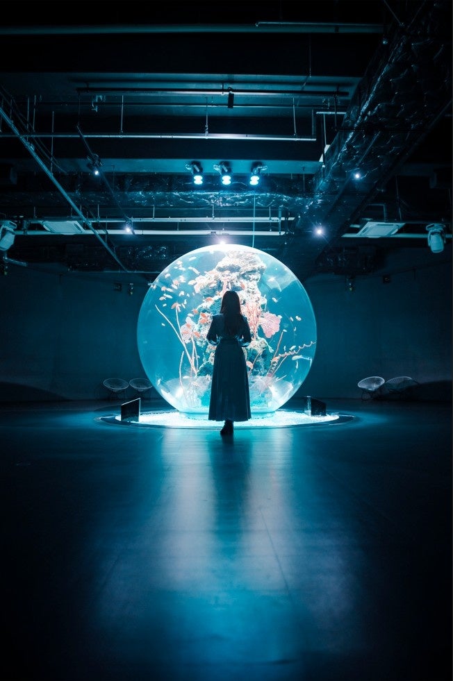 国内最大級の球体水槽“AQUA TERRA”は、宇宙・深海をイメージした『PLANETS 奇跡の惑星』ゾーンにあり、直径3メートルで国内最大級を誇る水槽。この水槽を中心に、360°全方位をミストとレーザーが織り成すパフォーマンス「AQUA UNIVERSE」を上演しています。※12/25(木)まで期間限定でクリスマス演出に変わっています。