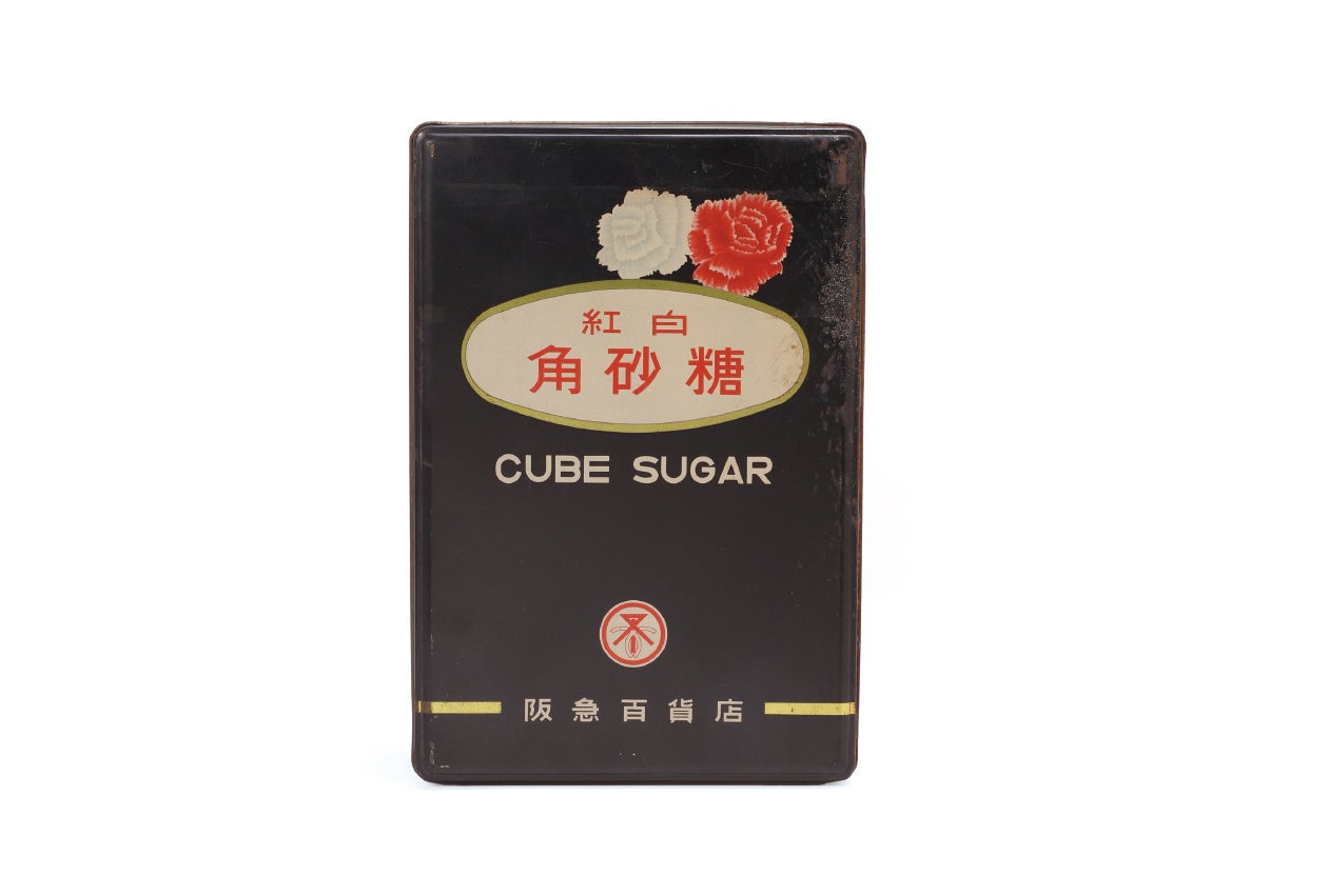 紅白角砂糖用の角型缶                       結婚式の引き出物などに用いられたと推察される角砂糖用のふた付き角型缶。