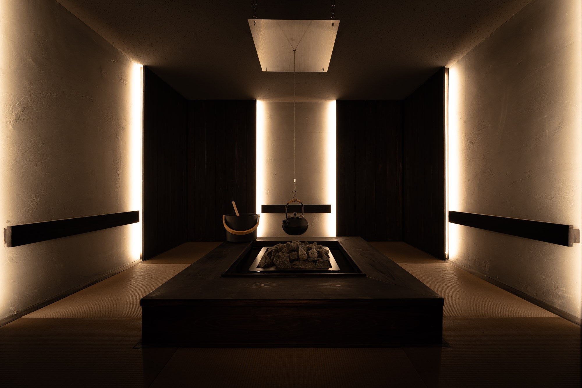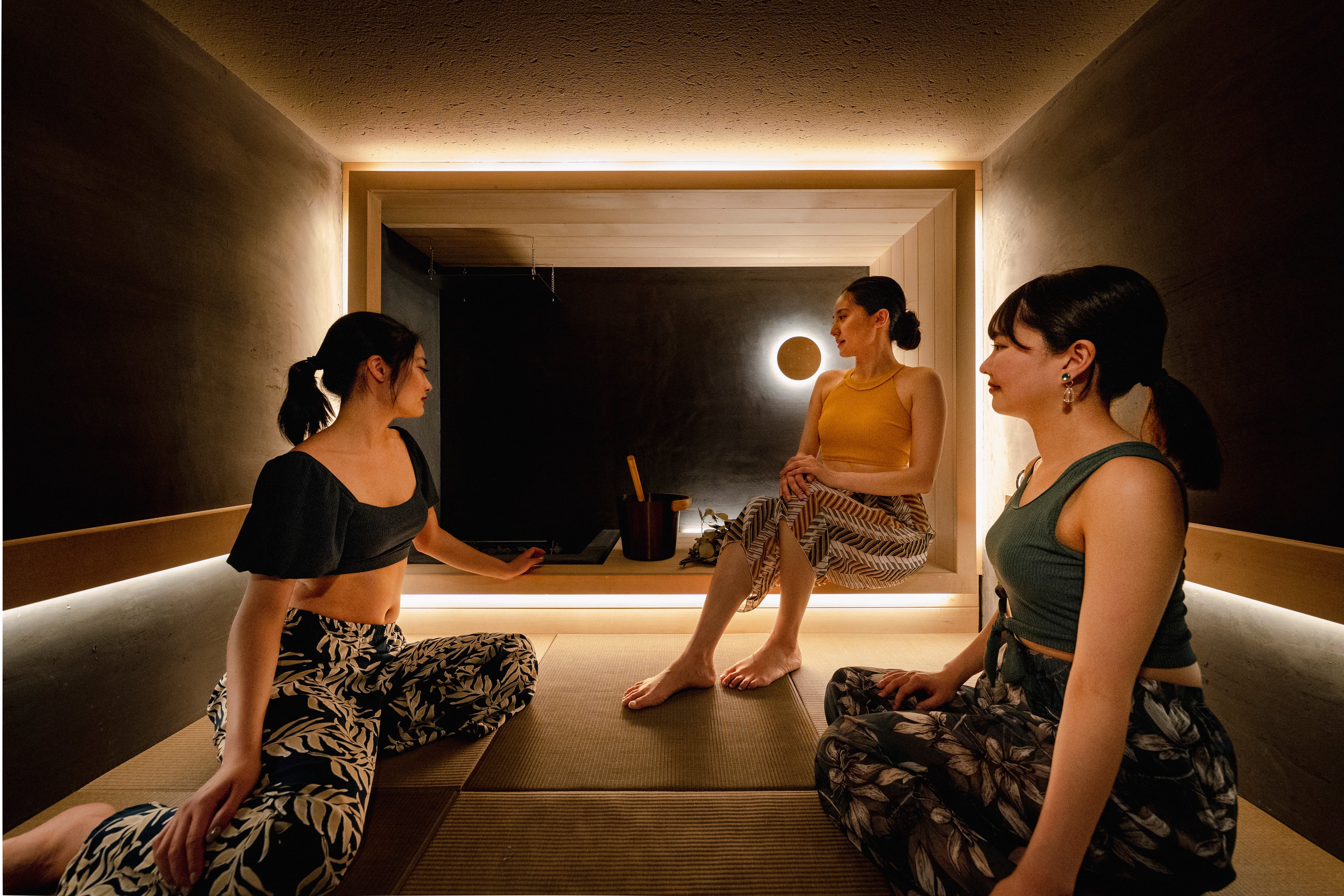 わたしたちは、慌ただしい日々をスローにゆるめ、自分と向き合う時間に寄りそうお茶、自分や目の前の人と向き合える茶室に込められた、東洋文化を大切にした企画開発を行ってきました。コミュニケーションサウナ「OOO」は、フィンランド式サウナと茶室をかけ合わせた特別な空間。サウナ室を茶室、水風呂を坪庭、休憩スペース(内・外気浴場)を縁側に見立てています。床に座って仲間とじっくり語り合い、ととのい、自分自身や仲間と向き合える場です。