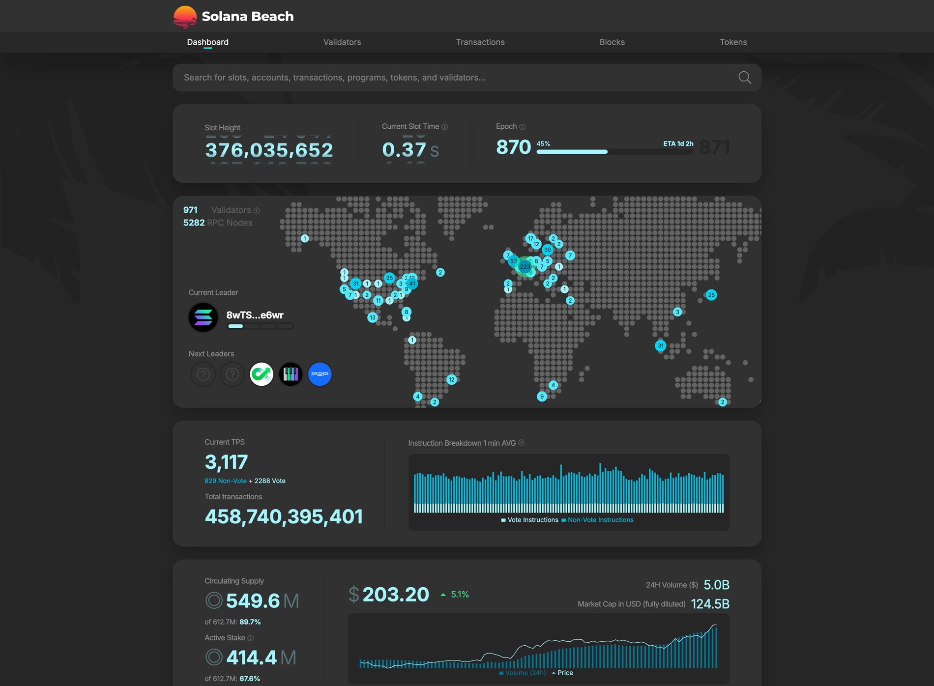 Validator Map を見ると、ステークが欧州・北米・アジアに広く分散していることが分かります。この分布は、そのまま「どの時間帯に、どの地域が有利になるか」という形でアプリケーションの体感速度にも影響します。