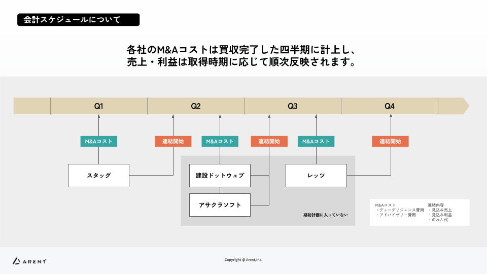 本件に伴う株式取得費用・アドバイザリー費用などの一過性のコストは、2025年6月期第3四半期に計上される想定です。一方で、レッツの売上および利益は、第4四半期からの連結取り込みを想定しています。また、今期の通期業績予想には、スタッグ社までのM&Aの影響は織り込んでいますが、建設ドットウェブ、アサクラソフト、本件レッツの3社については織り込んでいません。現在、これらを踏まえた計画の精査を進めており、必要があれば速やかに開示を行います。
