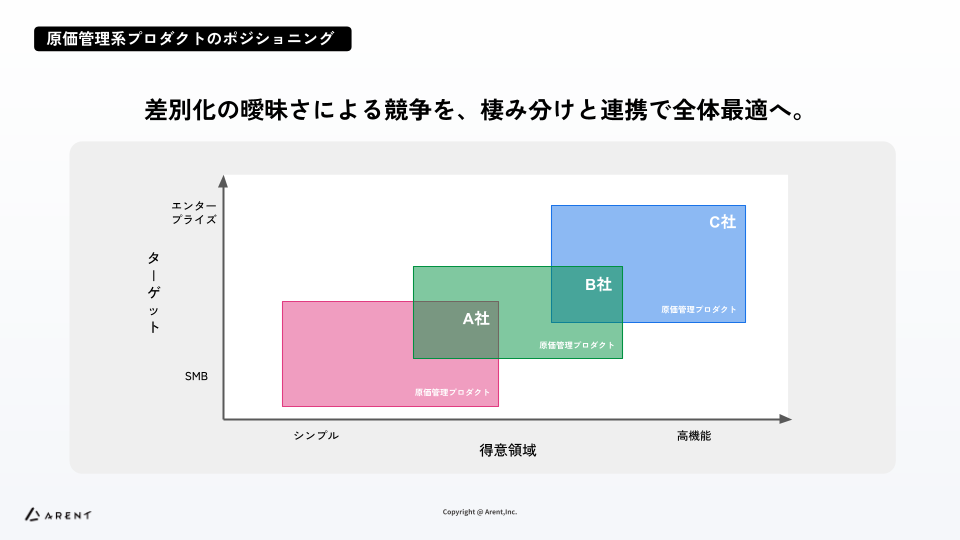 Arentは、グループ内プロダクトの役割・強みを明確化し、顧客規模・業務特性に応じた最適配分を行います。