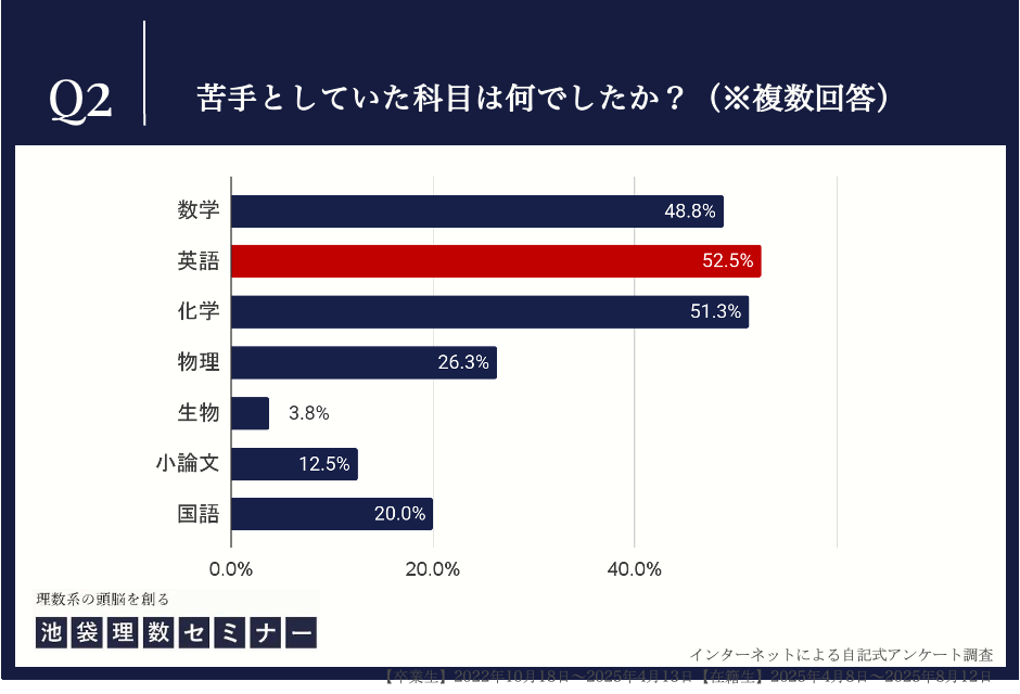 苦手としていた科目を尋ねたところ、理系受験の根幹である「数学」(48.8%)や「化学」(51.3%)を抑え、「英語」(52.5%)が最多となりました。