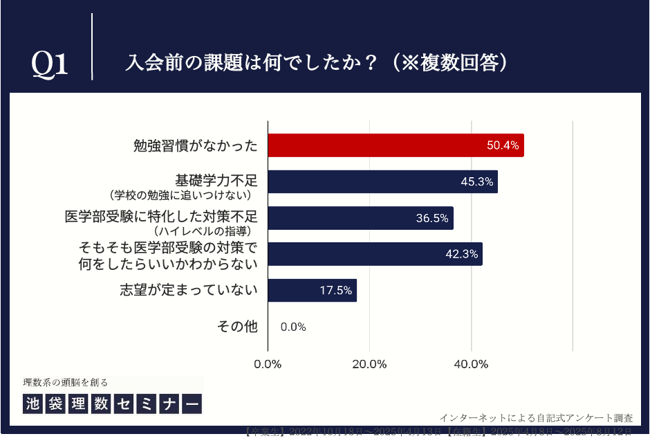 調査概要:医学部専門塾池袋理数セミナー入会前の生徒が抱えていた課題と苦手科目に関する調査