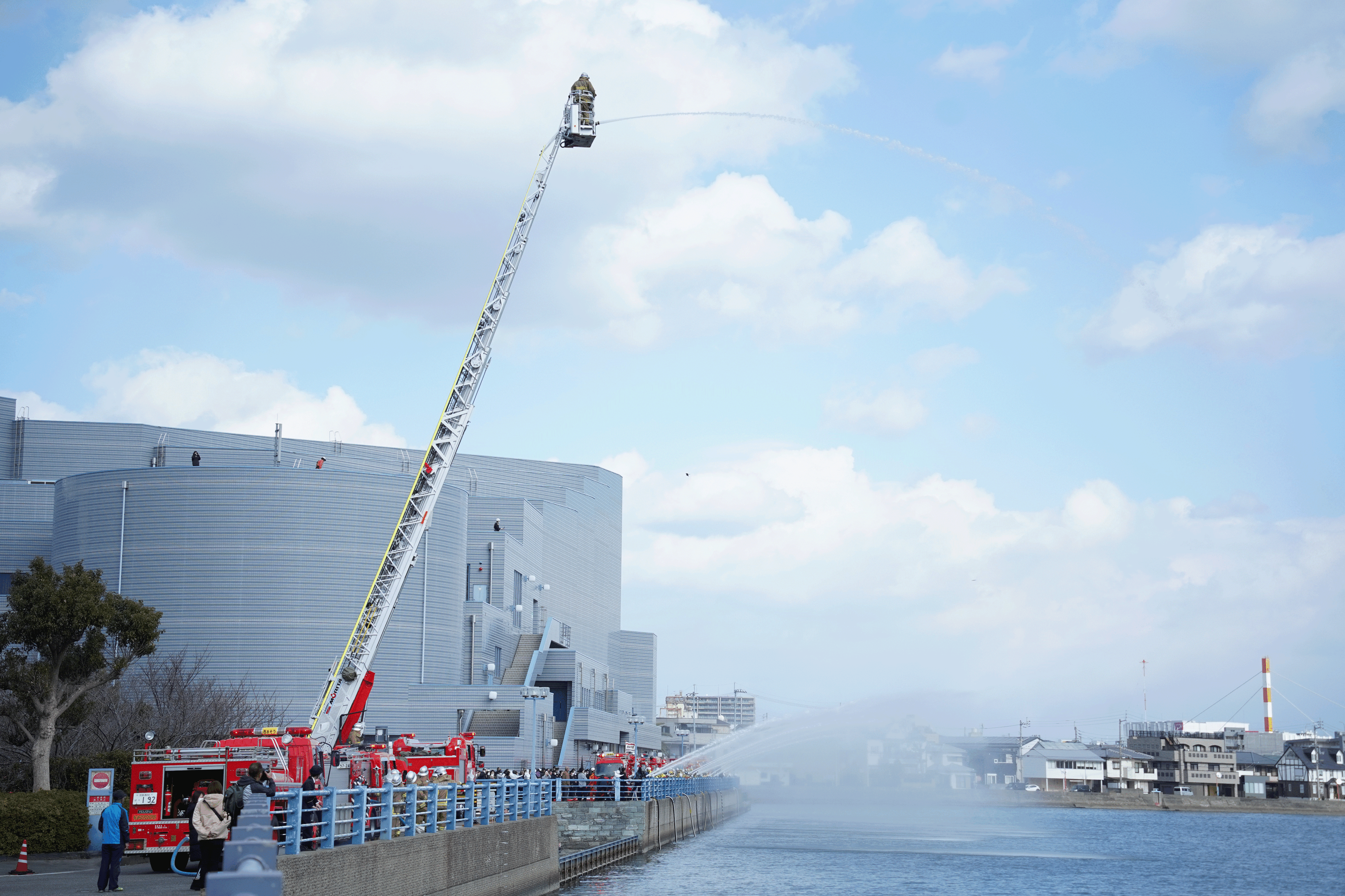 11:40~ 消防車両による祝賀放水(アスティとくしま東側園瀬川沿い)