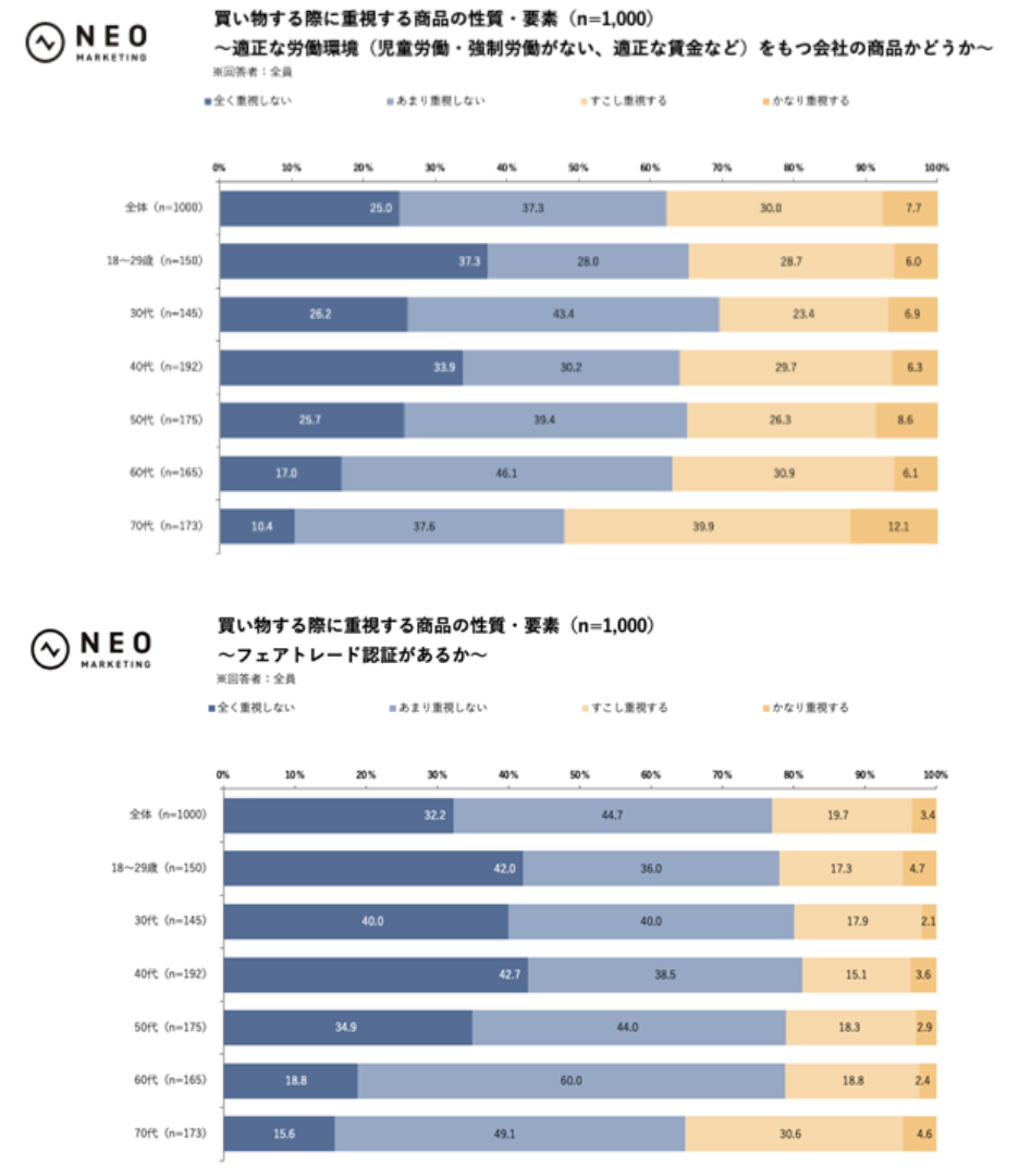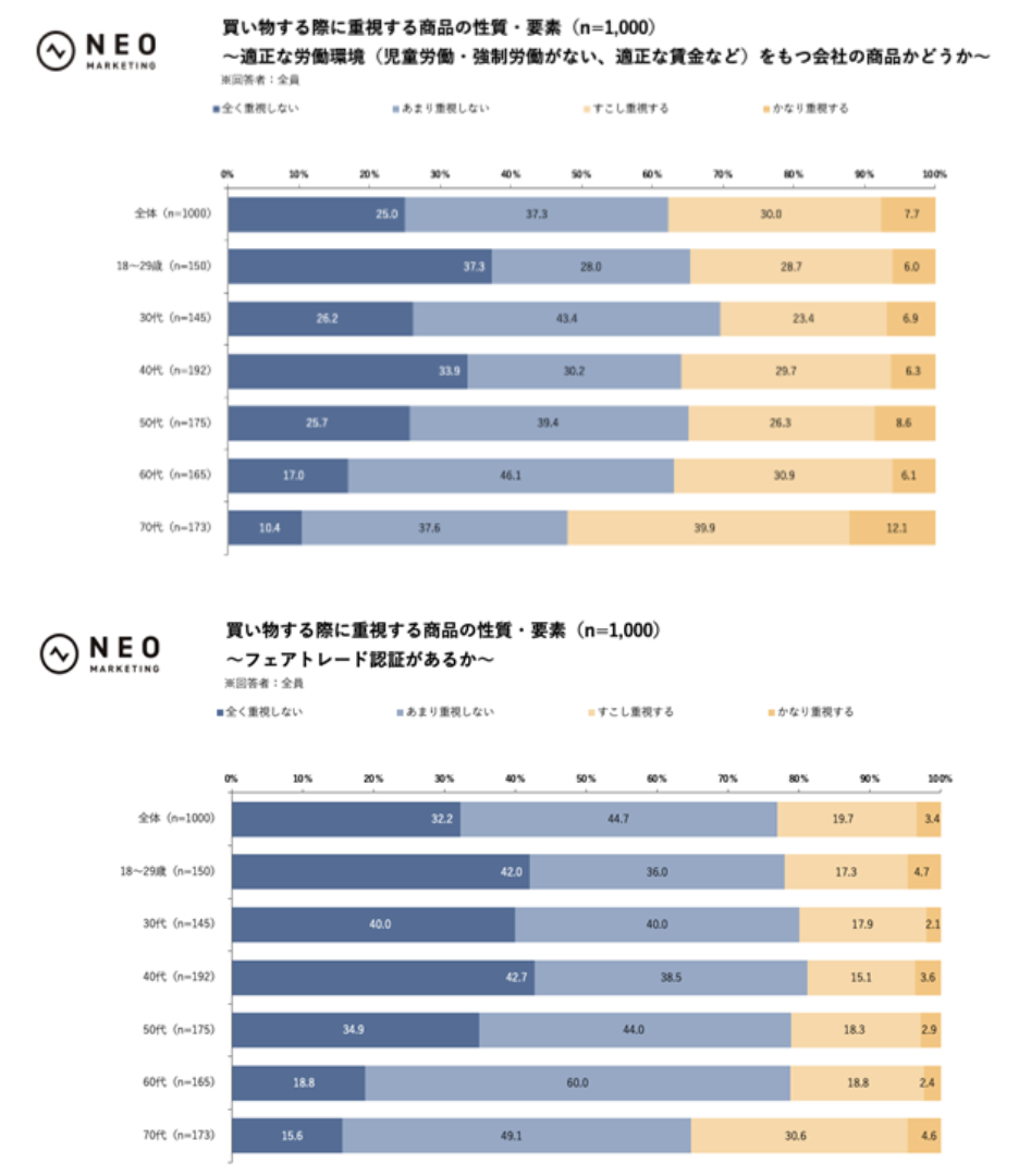 多くの項目においてシニア層の重視度が高くなっていましたが、最もそれが際立ったのが70代。「フェアトレード認証があるか」「適正な労働環境(児童労働・強制労働がない、適正な賃金など)をもつ会社の商品かどうか」「戦争・紛争に加担している国や会社の商品かどうか」「自然環境や動物福祉への配慮がなされた商品かどうか」「うなぎなど絶滅のおそれがある食べ物ではないか」では他の年代と10ポイント以上の差が生じていました。70代は特に、価格や機能だけでなく、背景にある生産環境や倫理性も含めて商品を選ぶ姿勢が強いと言えます。