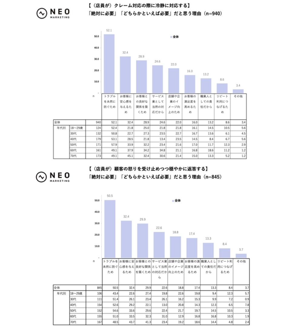 前掲した設問【スーパー・コンビニ・小売店等で接客を受ける際に必要だと思う対応】にてそれぞれの対応を「絶対に必要」「どちらかといえば必要」もしくは「不要だと思う」「どちらかといえば不要」と回答した人に対し、その理由をお聞きしました。