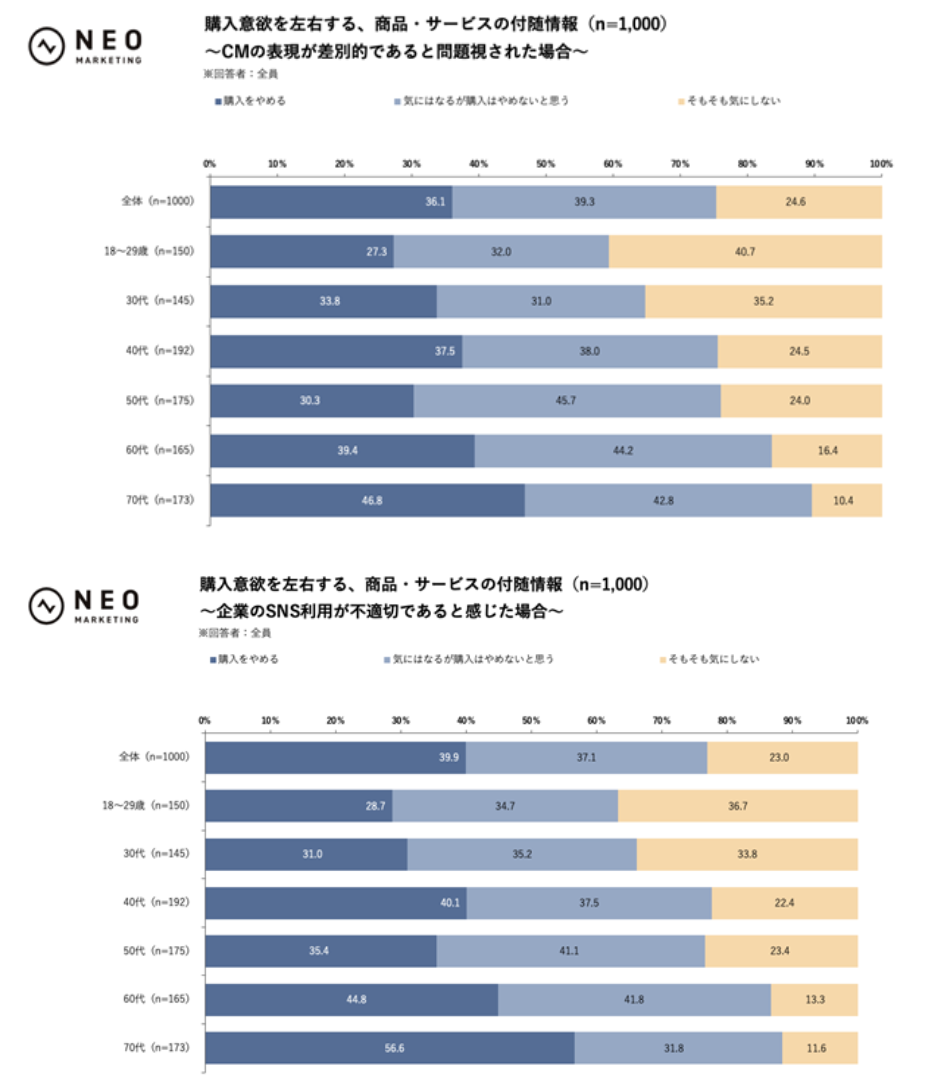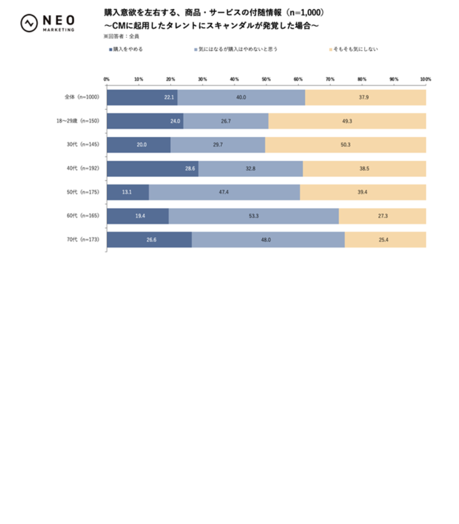 また、「CMに起用したタレントにスキャンダルが発覚した」「CMの表現が差別的であると問題視された」場合でも、購入を控える人は多数派とは言えず、SNS上では大きく炎上するテーマであっても、生活者全体の購買行動に与える影響は限定的である可能性がありそうです。