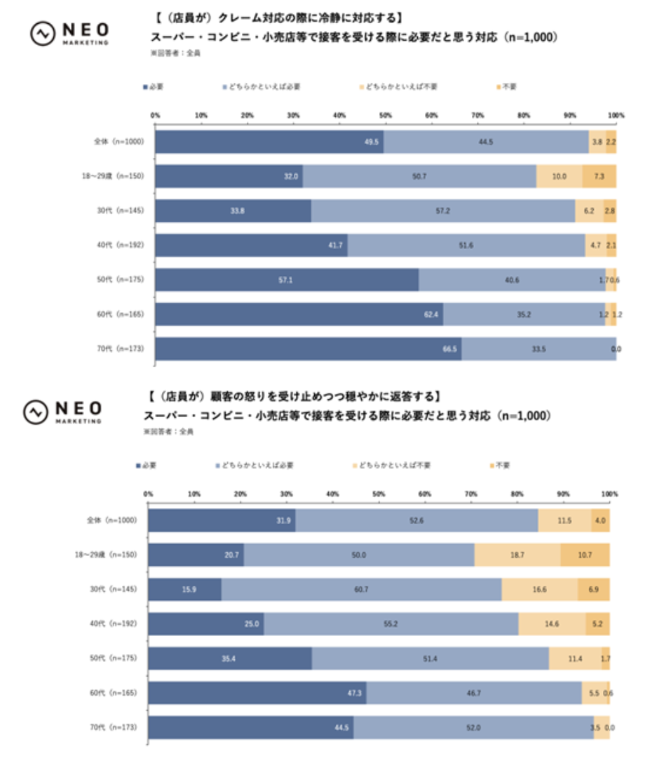「クレーム対応の際に冷静に対応」「顧客の怒りを受け止めつつ穏やかに返答」といった、場を荒立てない振る舞いは年代を問わず約70~90%(※1)が「必要」と捉えていることが明らかに。しかし、この2項目について最も肯定的な立場(「必要」と回答した割合)で比較すると、特に60~70代のシニア層は他の年代よりも高く、若年層(18~29歳)とはそれぞれ12.1~12.5ポイント・30.4~34.5ポイントもの開きがありました。店員に対し、客側のイライラや不安な気持ちに寄り添って欲しい、という期待がシニア層はより強いことがうかがえます。