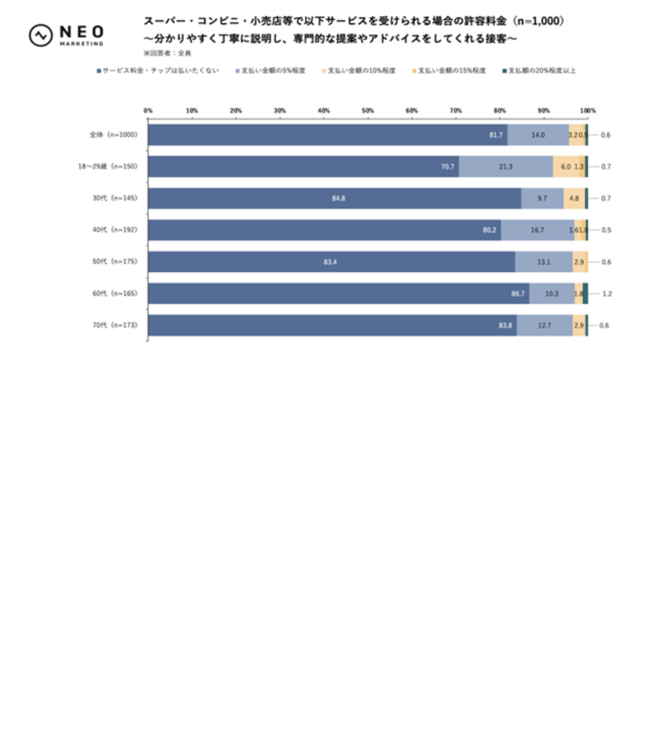 全体としては「接客のために追加料金までは払いたくない」という意識が根強いことがわかりました。特に「笑顔や穏やかな態度での接客」「安心感や信頼感を与えてくれる接客」は、有料サービスというより「それくらいは通常サービスとして当然」という前提で受け止められているようです。