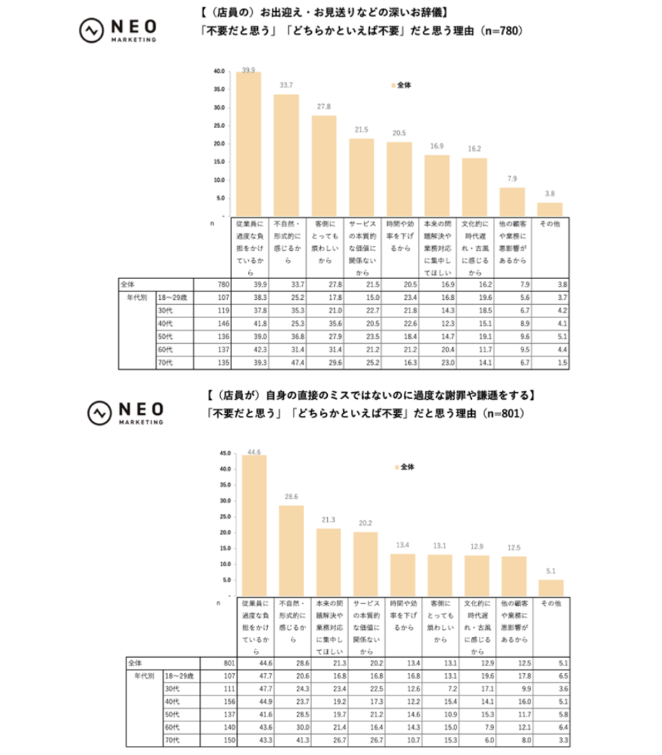 一方で、「過度に丁寧な敬語」「雑談や世間話まで笑顔で応じること」は賛否が分かれ、「深いお辞儀」や「自身の直接のミスではないのに過度な謝罪や謙遜をする」といった儀礼的・自己犠牲的なおもてなしは約70~80%(※2)が「不要」と見なされています。