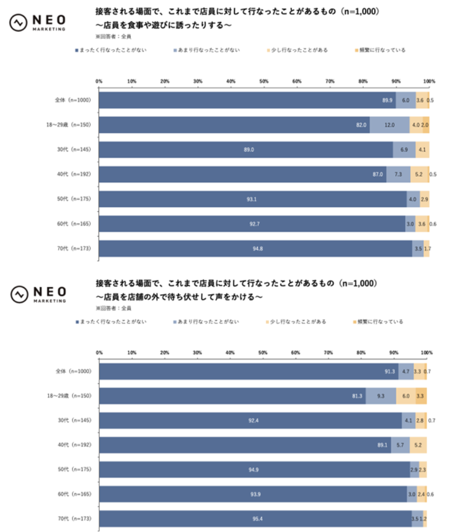 全体としては、いわゆる「カスハラ」にあたる行為を行ったことのある人は少ないが、経験者は若年層に偏る傾向にあった。店舗外で店員を待ち伏せしたり、店舗から出てきた店員の後をつけたりといった、ストーキング行為にあたる行為をとってしまう若年層もいる。「丁寧な接客」は店員の労働負担になるという理解はあっても、店員の人権に対する本質的な理解はともなっていない可能性がある。
