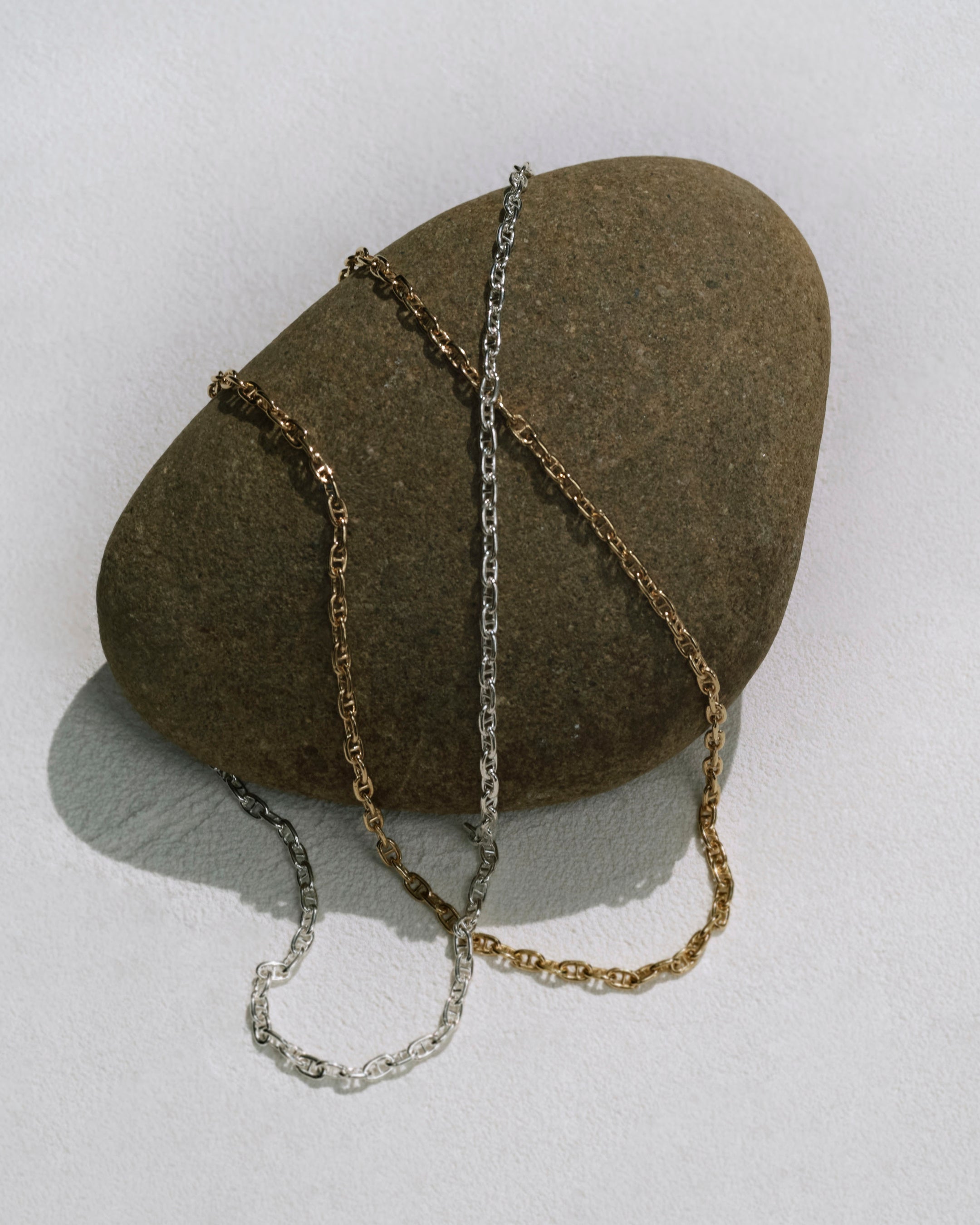船と錨を繋ぐアンカーチェーンをデザインソースにしたPORT CHAIN(ポートチェーン)シリーズ。θ型のコマを連ねた普遍的なデザインでありながら、留め具は小さくても使いやすいカニ手とオリジナル型のエンドプレートを使用し、細部まで拘った作りに。程よい50cmの長さで様々なスタイルにマッチするアイテムです。