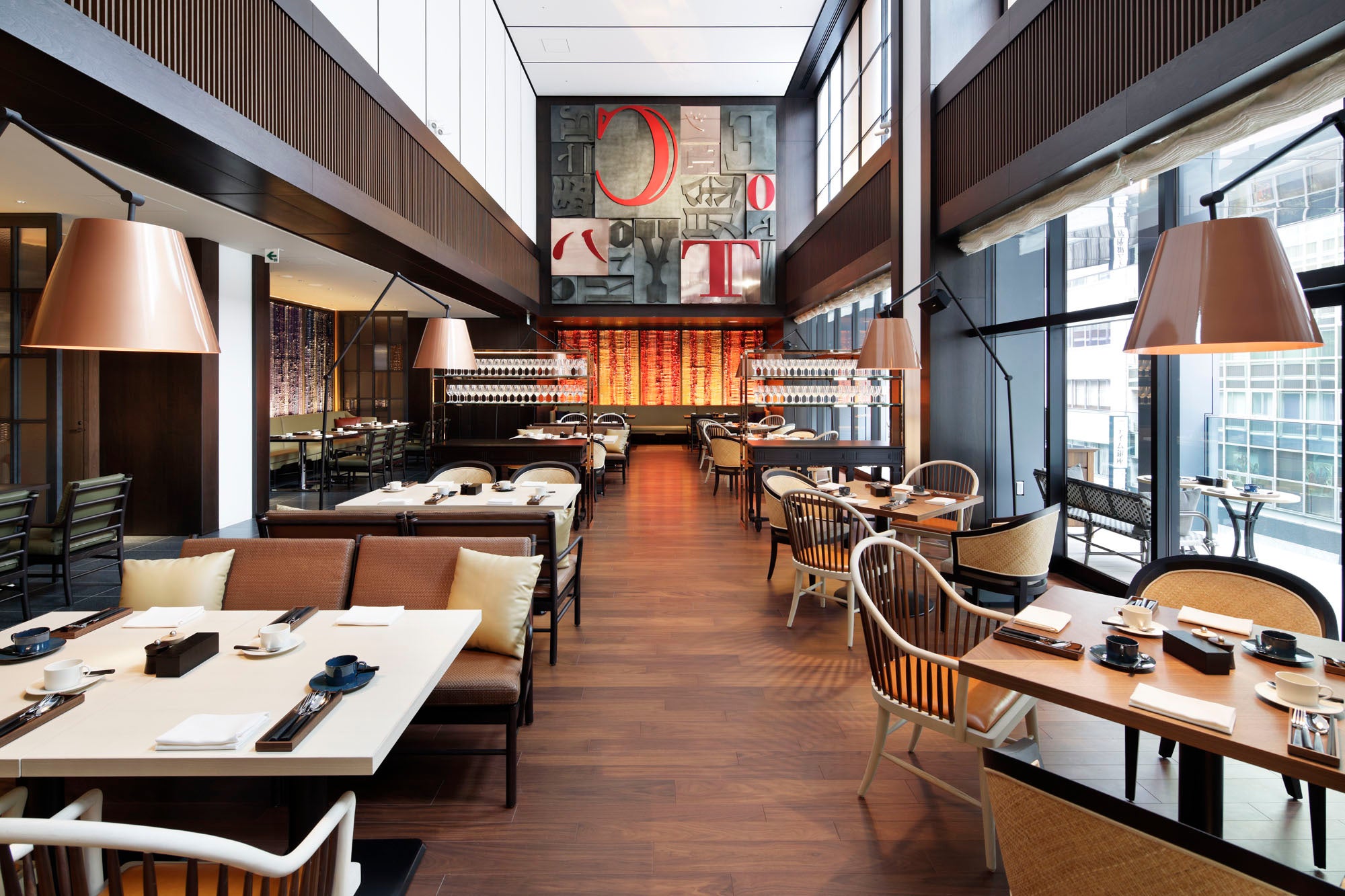 ライブ感溢れるショーキッチン、大きなオーブンから立ち込める鼻腔をくすぐる芳醇な香り、そして旬の食材と調味料をふんだんに取り入れた、自然の恵みあふれる温かみのある料理が、五感で愉しむ「食」へと誘います。約 40 mの並木通り沿いのテラスでは、時間、季節ごとに刻々と変化する銀座の情景を臨めます。