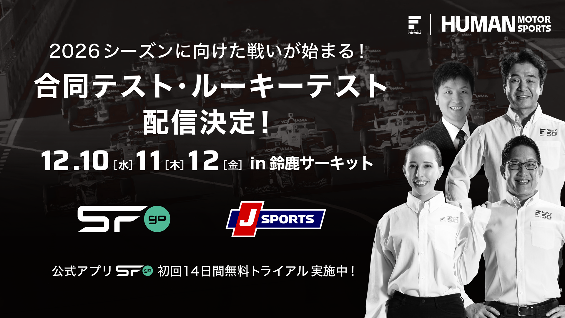 ・12/10(水)・11(木)・12(金) 合同テスト・ルーキーテストin 鈴⿅サーキット『SFgo』『J SPORTS』での配信決定!早くも2026シーズンに向けた戦いが始まります!是⾮、お見逃しなく!→ https://superformula.net/sf3/release/24226/