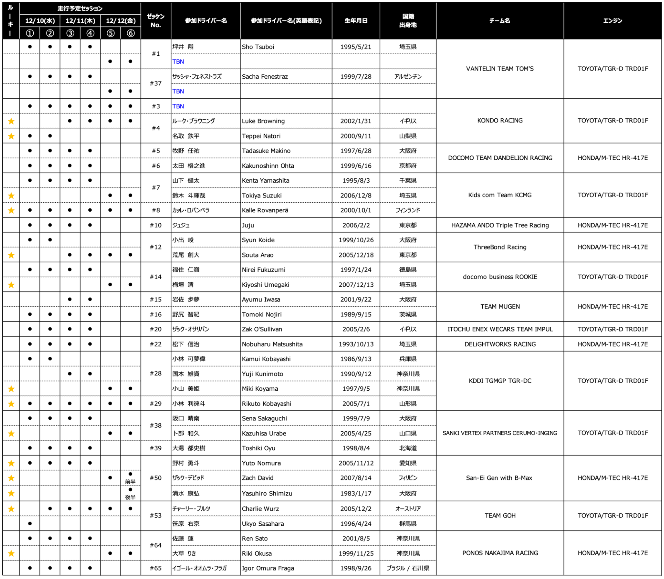12/5時点で、15チームから総勢33名(ルーキー14名、海外勢7名)がエントリー!既に2026シーズンからの参戦が発表されている「DELiGHTWORKS RACING」に加えて「TEAM GOH」が2022シーズン以来の参戦!