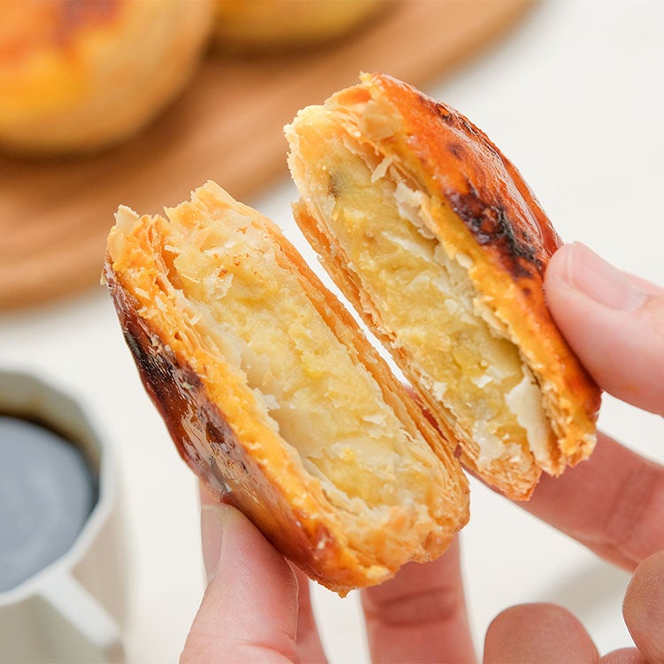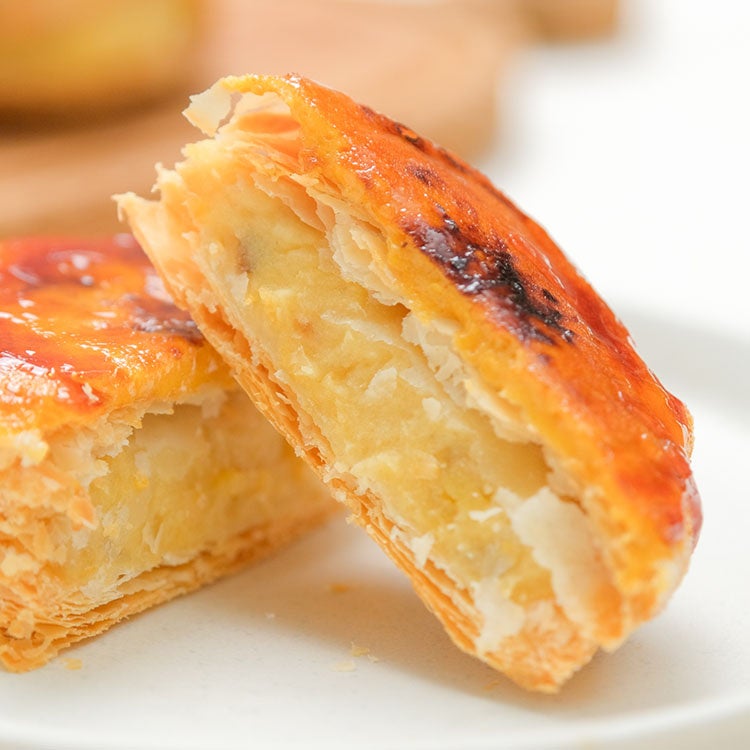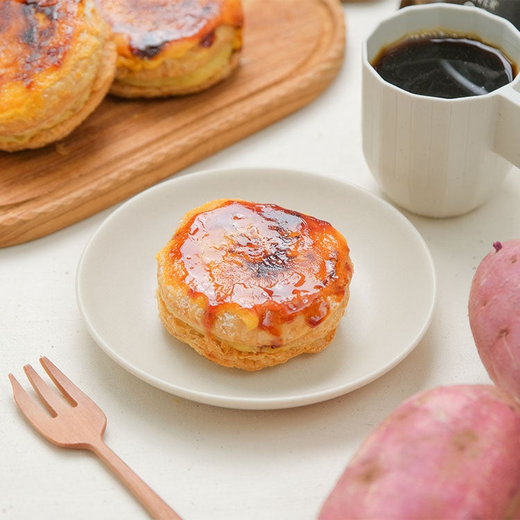 本商品は、香ばしくキャラメリゼしたパリッとした表面と、サクサクのパイ生地の食感が楽しめるおやつです。中には、低温でじっくり焼いて甘みを引き出した紅はるかを使った濃厚なスイートポテトクリームをたっぷり詰め込みました。ひと口かじると、バター香るパイの香ばしさと、さつまいもクリームの濃厚なコクが広がり、最後にブリュレの香ばしさがふわりと抜ける、余韻まで贅沢なおやつです。