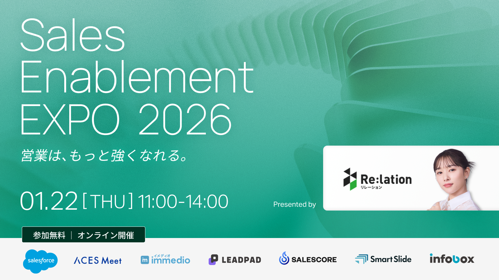 顧客対応クラウド「Re:lation(リレーション)」を提供し、6,000社以上(※1)の導入実績を誇る株式会社インゲージ(本社:大阪府大阪市、代表取締役:和田 哲也)は、2026年1月22日(木)に、オンラインカンファレンス「Sales Enablement Expo 2026 - 営業は、もっと強くなれる。」を主催・開催することをお知らせします。