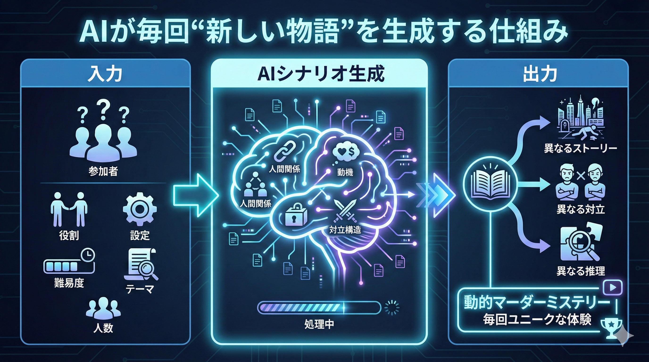 毎回違うストーリー・役割・伏線・対立構造を自動生成。