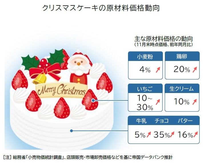 2025年のクリスマスケーキは、昨シーズンに比べてイチゴ、乳製品、カカオなど主要な原材料費が大幅に値上がりした影響を強く受けた。ケーキに欠かせない「イチゴ」は、猛暑による影響から生育が不安定で、11月時点の市場価格ベースで前年比10~30%前後値上がりし、クリスマスシーズンにかけてさらに価格が上昇するとみられる。スポンジ生地等に欠かせない鶏卵は、生産コストの高止まりに加え、鳥インフルエンザの感染拡大による供給懸念を背景に前年比2割高で推移し、「エッグショック」と呼ばれた2023年にせまる高値圏となった。ショコラケーキなどでは、チョコレートの原材料となるカカオが主産地である西アフリカでの異常気象の影響で記録的高値となり、前年比で3割以上の値上がりとなっている。