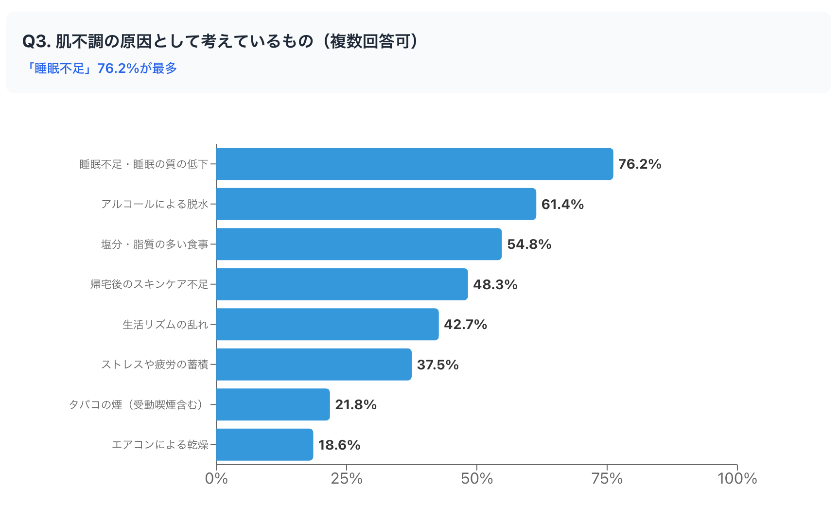 Q3. 肌不調の原因、「睡眠不足」76%、「アルコールによる脱水」61%