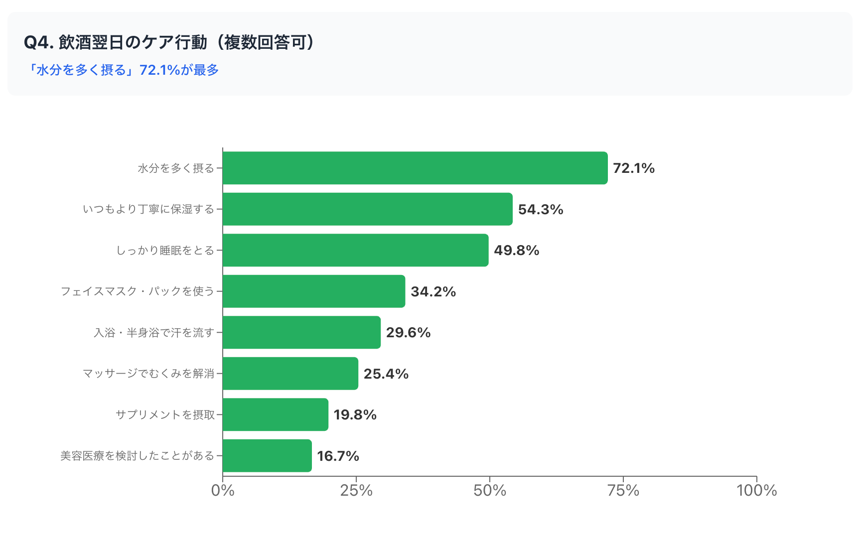 Q4. 飲酒翌日のケア行動、「水分を多く摂る」72%、「いつもより丁寧に保湿」54%