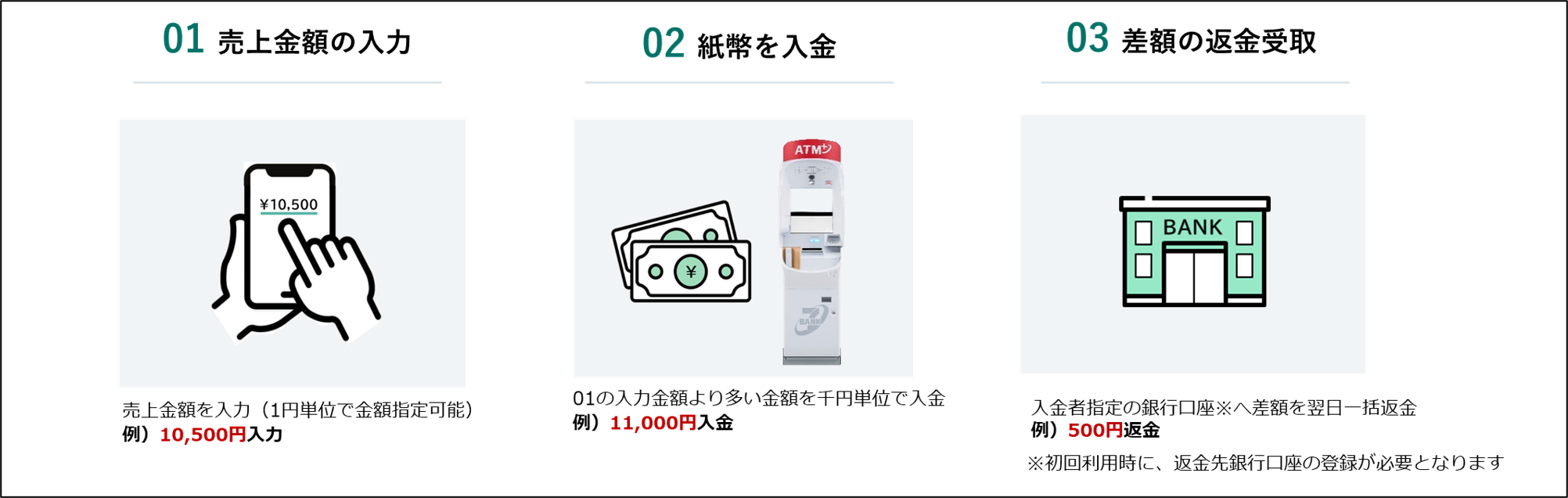 従来の「ATM集金」では、専用管理画面から千円単位で売上金管理が可能でしたが、このたびの新機能「1円単位集金オプション」により、硬貨分も含めた1円単位での売上金管理が可能となります。専用アプリに1円単位の任意の売上金額を入力し、入力金額よりも多い現金を千円単位で入金することで、差額を入金者指定の返金先銀行口座に返金するサービスです。