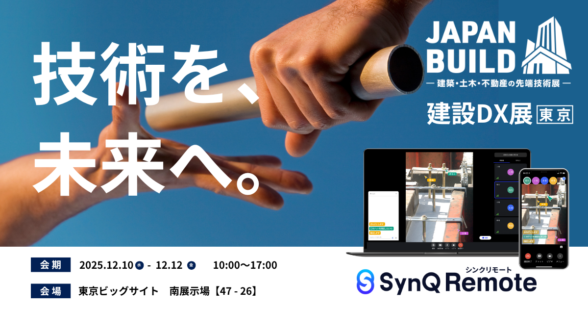 誰とでもつながれる。圧倒的に伝えられる。現場が求めたコミュニケーションツール「SynQ Remote(シンクリモート)」を開発提供する株式会社クアンド(本社:福岡県北九州市、代表取締役CEO:下岡 純一郎)は、2025年12月10日(水)~12日(金)に東京ビッグサイトで開催される「ジャパンビルド-建設DX展」に出展します。会場では、遠隔巡視の法整備から1年で進んだ建設現場の遠隔化事例や、「人手不足」「技術継承」など現場が直面する課題への解決アプローチを紹介。“若手とベテランをつなぐ共創プラットフォーム”としての活用方法をご提案します。