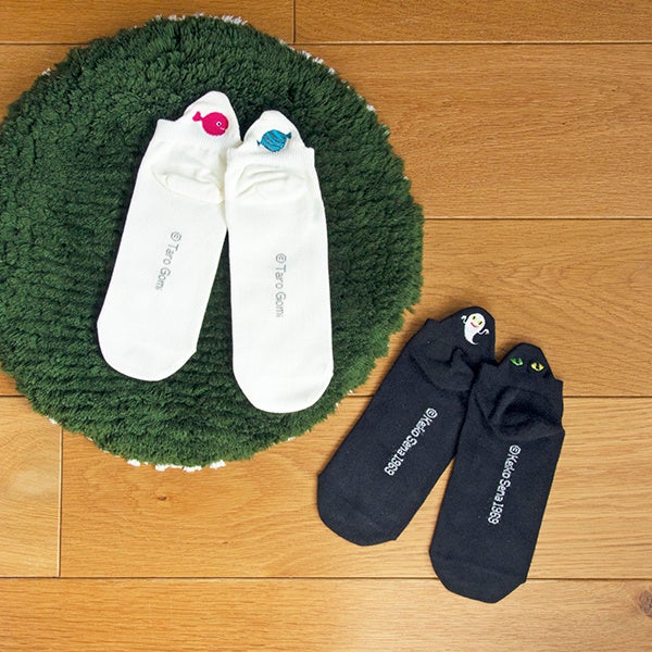 ロングセラー絵本の「かかと刺繍ソックス」。柄は絵本『きんぎょがにげた』と『ねないこ だれだ』の2種類で、レディースサイズのソックスです。
