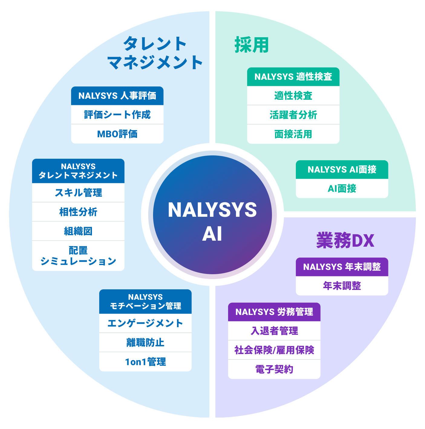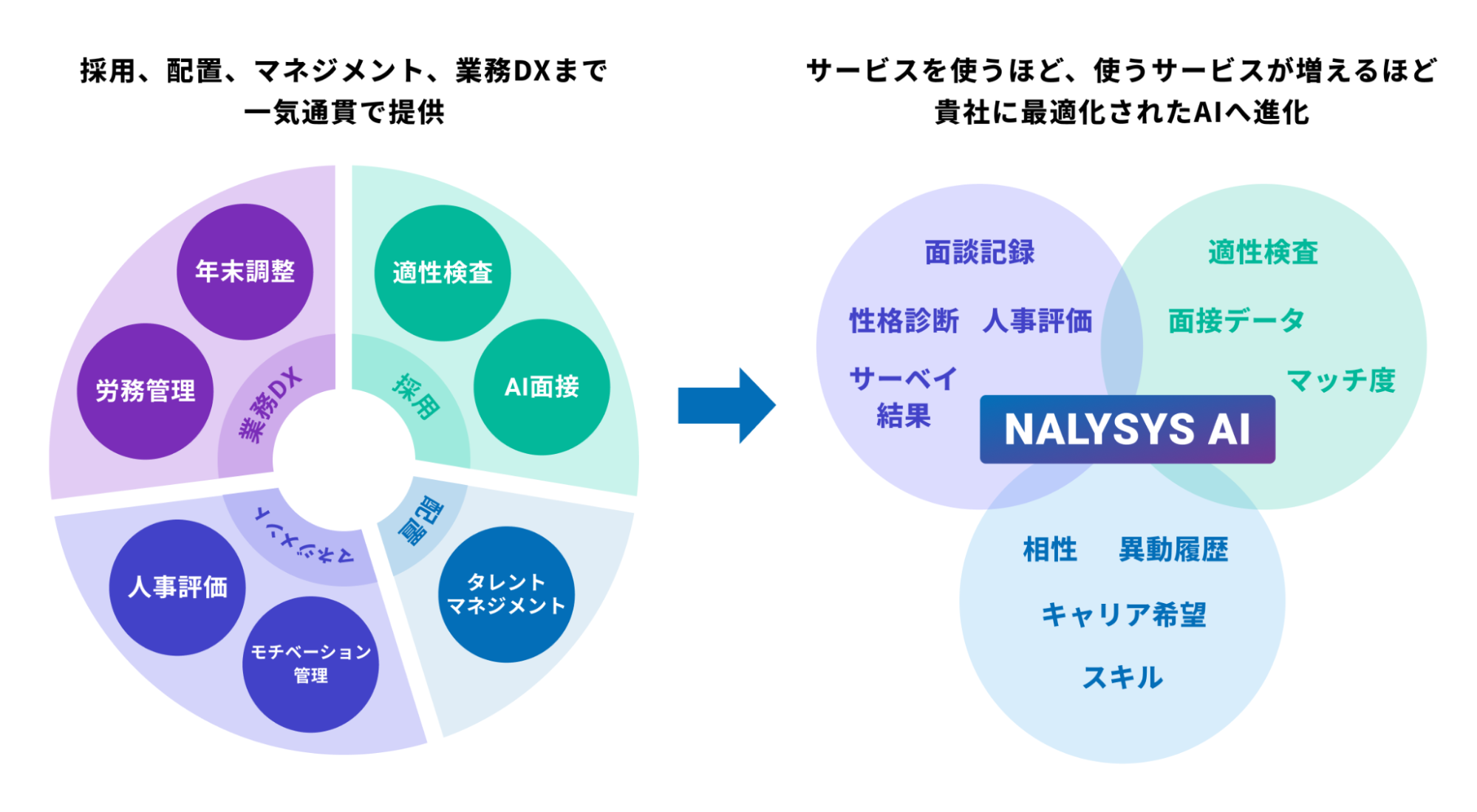 NALYSYS(ナリシス)は、採用から労務DXまで、組織づくりをトータルで支援するAIプラットフォームです。人事のノウハウと成果に直結するデータを備えたAIが、採用・配置・マネジメント・労務といったあらゆる業務を高度化し、組織の改善を強力にサポートします。社員一人ひとりの特性やWILLに寄り添った最適な組織づくりを実現し、「社員が活躍し、辞めない組織」へと導きます。