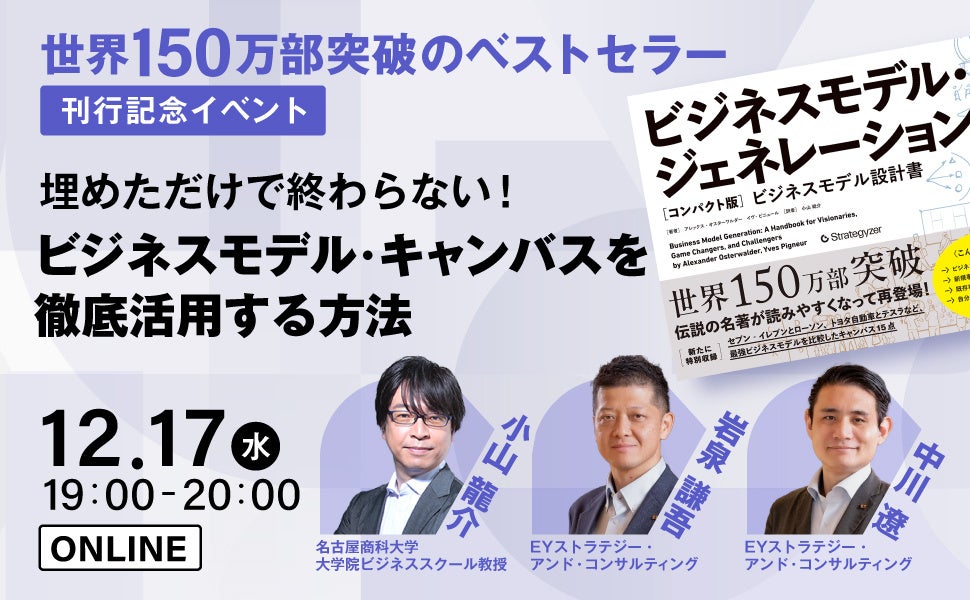 本書の発売を記念し、本書の翻訳者でありキャンバスを使った数々のワークショップを行ってきた小山龍介氏と、新規事業開発に取り組む数々の現場を支援してきたEYストラテジー・アンド・コンサルティングの岩泉謙吾氏、中川遼氏によるイベントを開催します。「ビジネスモデル・キャンバス」を埋めるだけでなく、キャンバスを実務に役立て、応用する方法を徹底討論します