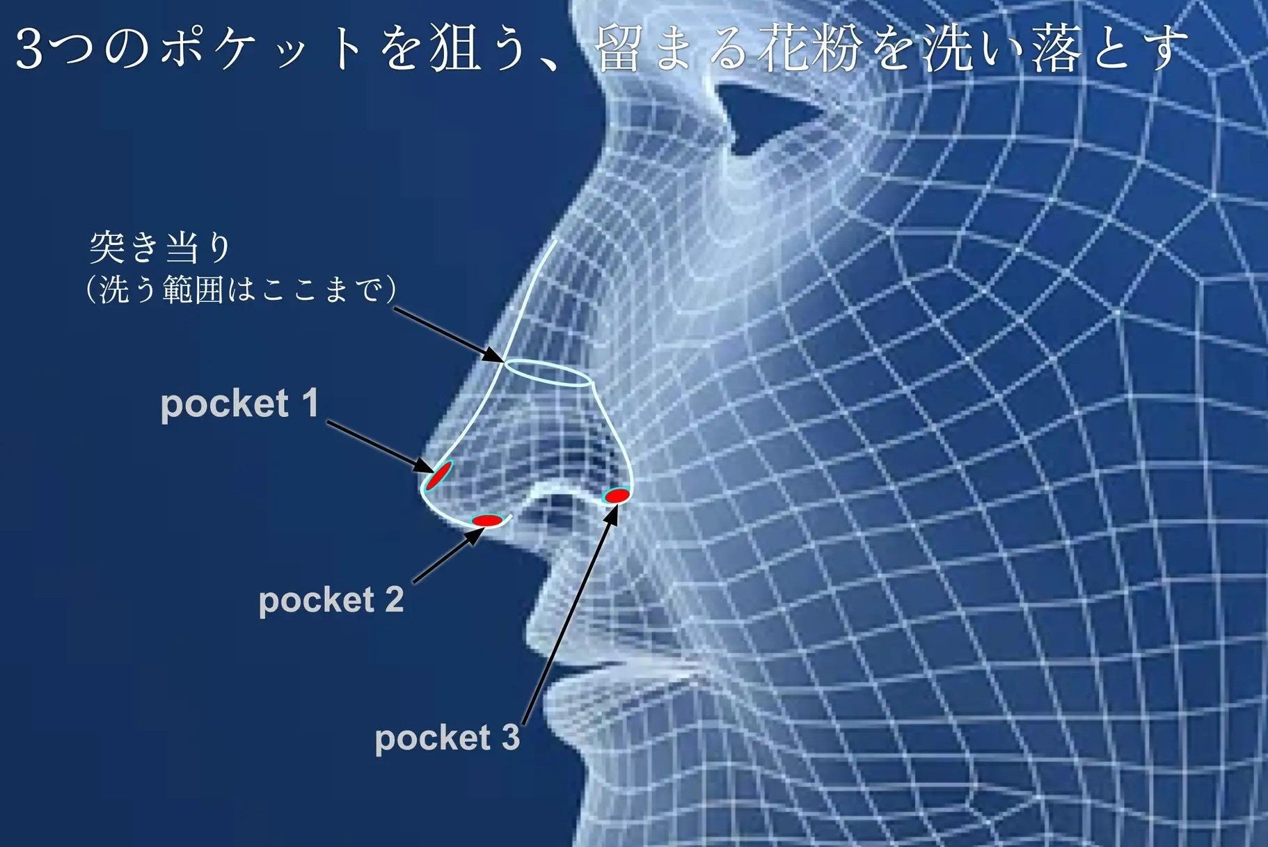 苦しいことはありません。洗う範囲は(上皮と分類される領域)異物が集中する入り口だけです。鼻毛や狭く歪な空間が80%の異物をこしとると言われています。その鼻のなかには窪み(pocket)が在り、そこに鼻水によって押し流された異物が集積すると考えられます。反応の強い部位を特定し、洗浄することにより、花粉対策は革命的にかわります。自身のからだが拒絶した、花粉などの異物を外に押し出す仕組みをやさしくアシストします。