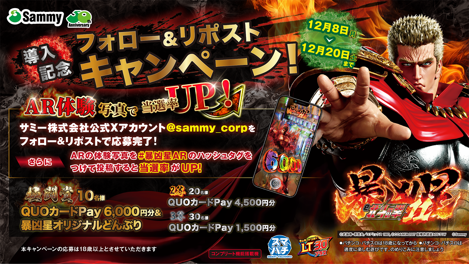 本キャンペーンは、サミー公式Xアカウント(@sammy_corp)をフォロー&リポストすることで応募が完了します。さらに、AR撮影を行い投稿することで当選率がアップしますので、ぜひAR体験もお楽しみください。※キャンペーンの概要については特設サイトをご確認ください。