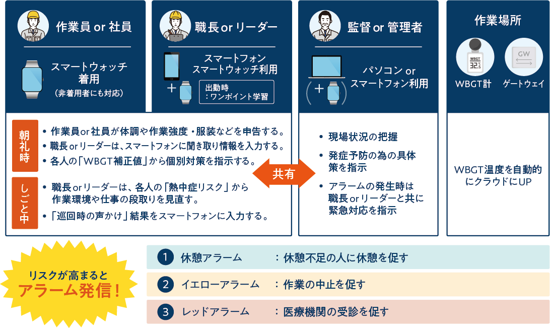「休憩アラーム」「イエローアラーム(作業中断)」「レッドアラーム(医療機関の受診)」が、関係者全員に発信されるので、タイムリーに対策を実行できる
