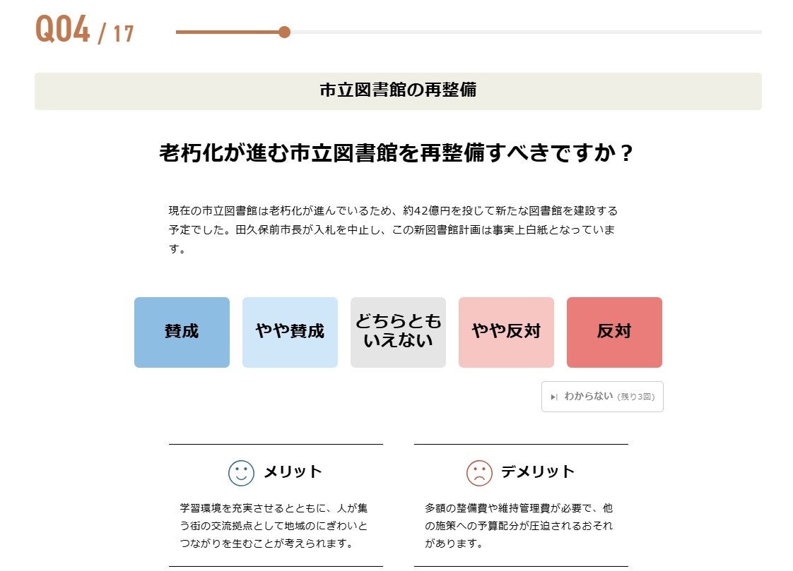 今回の市長選の「争点」として挙げられている市立図書館の再整備や物価高対策など幅広い分野の設問になりますが、全ての質問に概要を説明する「解説文」と「メリット」「デメリット」を記載することで、利用者の判断材料をご提供します。