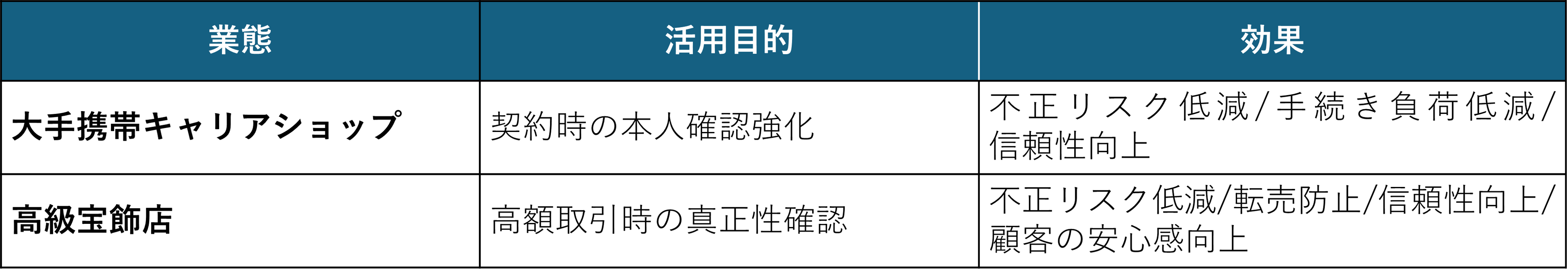 すでに大手携帯キャリアショップや高級宝飾店等、高度なセキュリティと効率的な本人確認が求められる現場で導入されています。来店者の本人確認を、提示された身分証明証をカードリーダーにかざすことで完了させています。従来の目視確認や書面手続きに伴う人為的ミスや業務負荷を削減しており、不正の抑止効果が十分に発揮されているとの評価を得ています。