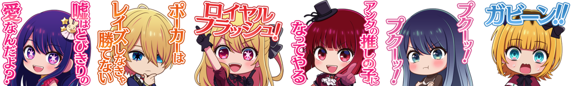 今回は、「m HOLD’EM」にTVアニメ『【推しの子】』の人気キャラクター、「アイ」、「アクア」、「ルビー」、「有馬かな」、「黒川あかね」、「MEMちょ」 が登場!