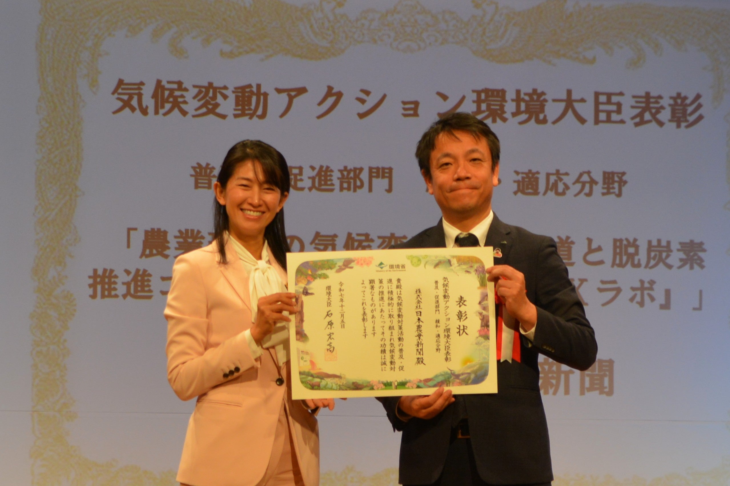 株式会社日本農業新聞(東京都台東区、代表取締役社長:田宮和史郎)は、気候変動対策に功績のあった個人や団体に贈られる2025年度の「気候変動アクション環境大臣表彰」を受賞しました。気候変動の農業現場への影響や対策に関する集中的・多角的な報道に加え、持続可能な食と農を目指すコンソーシアム「みどりGXラボ」による農業分野の脱炭素化の啓発が評価されました。